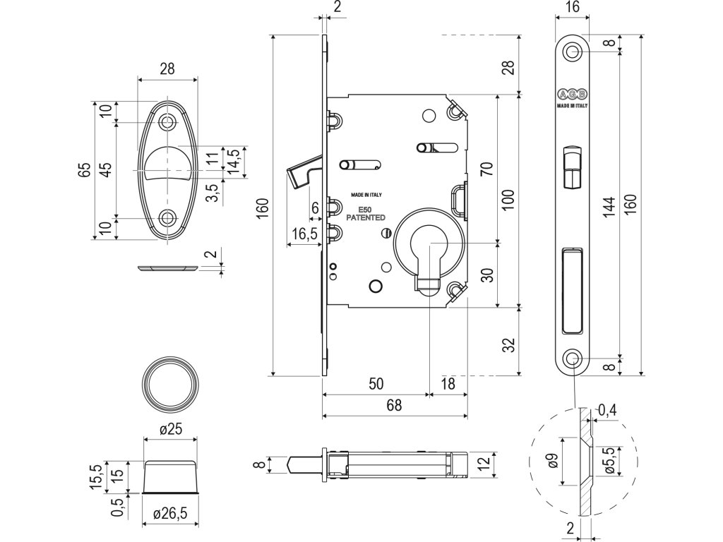 Kompletný set na posuvné dvere WAVE obsahuje: AGB - MUŠĽA WAVE na posuvné dvere Mušľa Wave talianskej značky AGB je moderný dizajnový kúsok, ktorý doslova vylepší vzhľad akýchkoľvek interiérových dverí. Minimalistický model na posuvné dvere je vyrobený z vysokokvalitného materiálu - zamak a je povrchovo upravený. Posuvné dvere ľahko otvoríte jednoduchým potiahnutím mušle. Mušľa má výšku 131,5 mm a šírku 69 mm. Ostatné rozmery nájdete v priloženom technickom liste. AGB - Zámok SCIVOLA TRE CLASS Scivola Tre Class je patentovaný zámok na posuvné dvere s minimalistickým dizajnom a vyťahovacou pákou, ktorá sa vyznačuje skvelou priľnavosťou. Skrytá vyťahovacia páka nahrádza ťah prstom a v dôsledku toho nie je potrebné vŕtať otvor. Dvere sa tým pádom posúvajú tým najhladším spôsobom.Dodatočné parametre