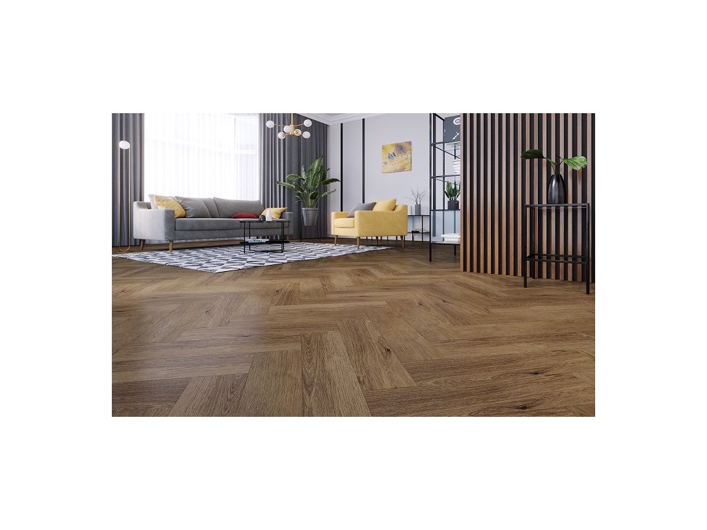 Kolekcia Amaron Herringbone predstavuje moderné podlahy s minerálnym jadrom vo vzore rybej kosti, ktoré spájajú eleganciu tradičného parketu s praktickosťou súčasných materiálov. Vďaka systému klikového spoja 5Gi sa montujú jednoducho a bez lepenia, pričom vytvárajú efekt luxusnej drevenej podlahy s presným geometrickým vzorom. Lamely s rozmerom 592 × 148 mm a hrúbkou 5 mm majú odolnú nášľapnú vrstvu 0,55 mm, čo zaručuje vysokú triedu záťaže 23/33/42, vhodnú nielen pre domácnosti, ale aj komerčné priestory.