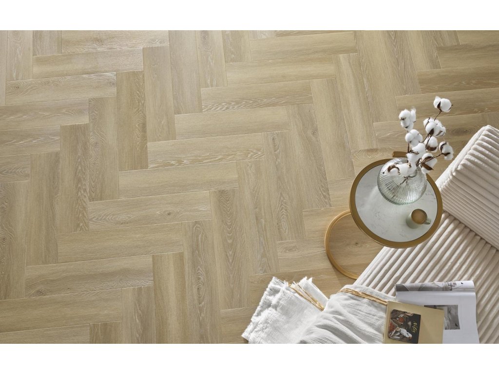 Kolekcia Amaron Herringbone EIR predstavuje moderné podlahy s minerálnym jadrom a s EIR štruktúrou vo vzore rybej kosti, ktoré spájajú eleganciu tradičného parketu s praktickosťou súčasných materiálov. Vďaka systému klikového spoja 5Gi sa montujú jednoducho a bez lepenia, pričom vytvárajú efekt luxusnej drevenej podlahy s presným geometrickým vzorom. Lamely s rozmerom 592 × 148 mm a hrúbkou 5 mm majú odolnú nášľapnú vrstvu 0,55 mm, čo zaručuje vysokú triedu záťaže 23/33/42, vhodnú nielen pre domácnosti, ale aj komerčné priestory.