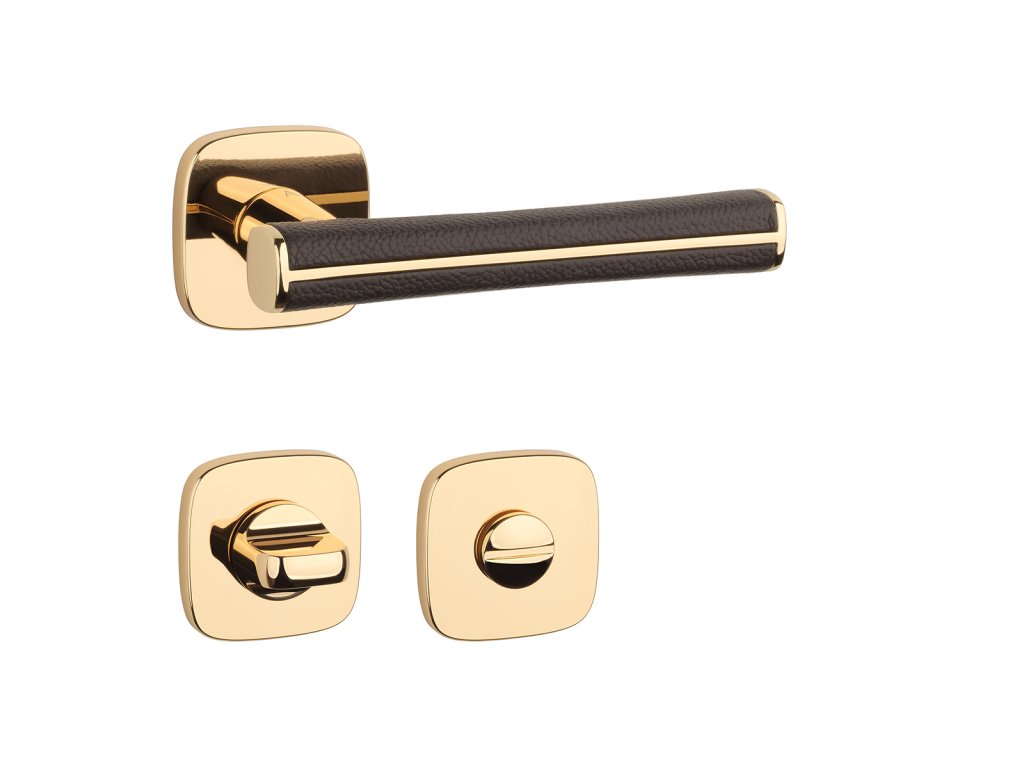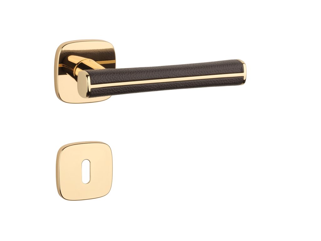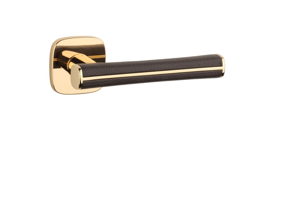 Rozetová kľučka na interiérové dvere s hranatou oblou rozetou je vyrobená z materiálov vysokej kvality - zamak a je povrchovo upravená. Špeciálny efekt vytvára hnedá koža, ktorá obopína rukoväť kľučky.