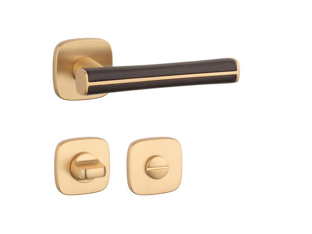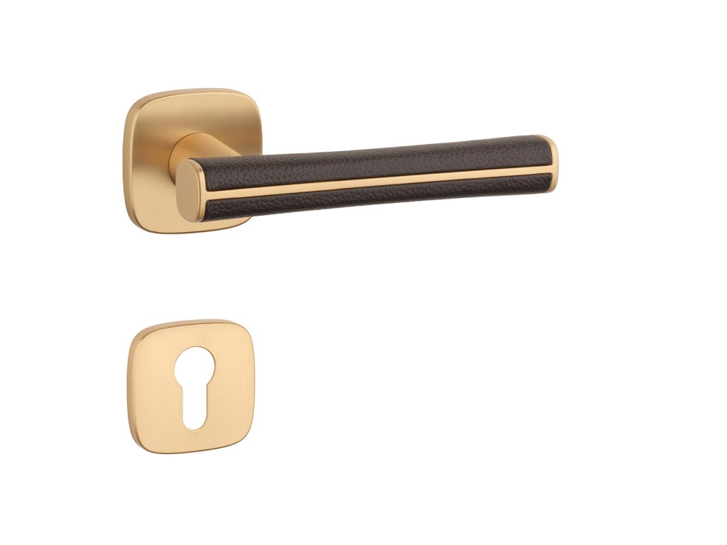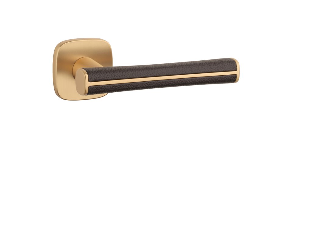 Rozetová kľučka na interiérové dvere s hranatou oblou rozetou je vyrobená z materiálov vysokej kvality - zamak a je povrchovo upravená. Špeciálny efekt vytvára hnedá koža, ktorá obopína rukoväť kľučky.