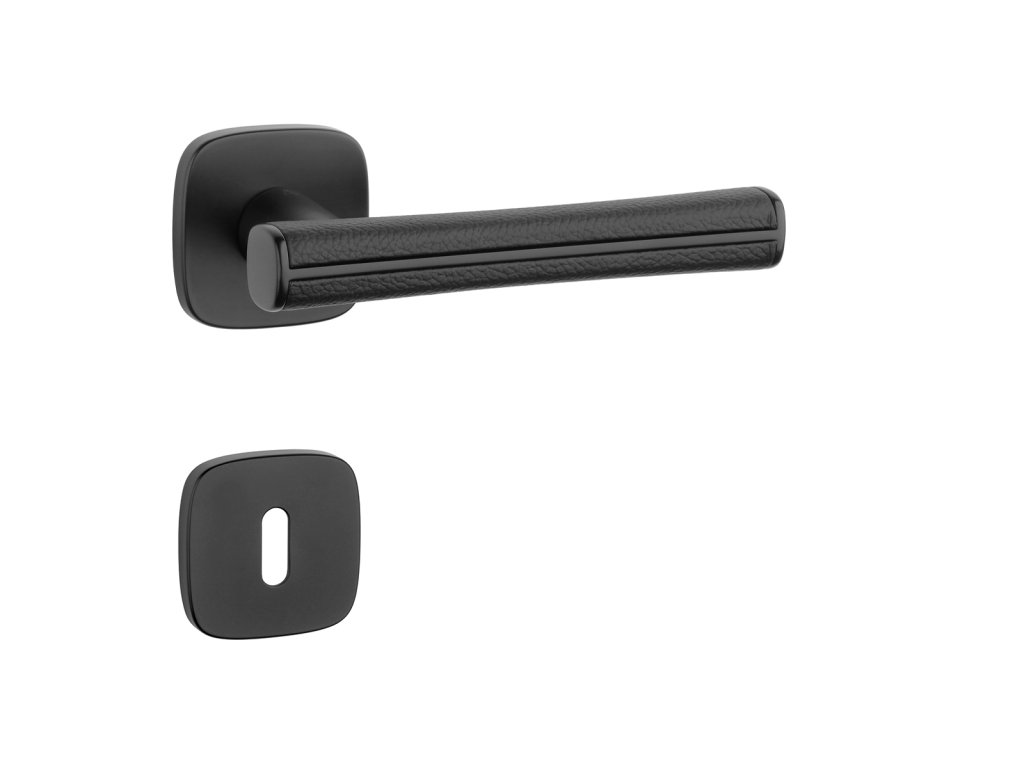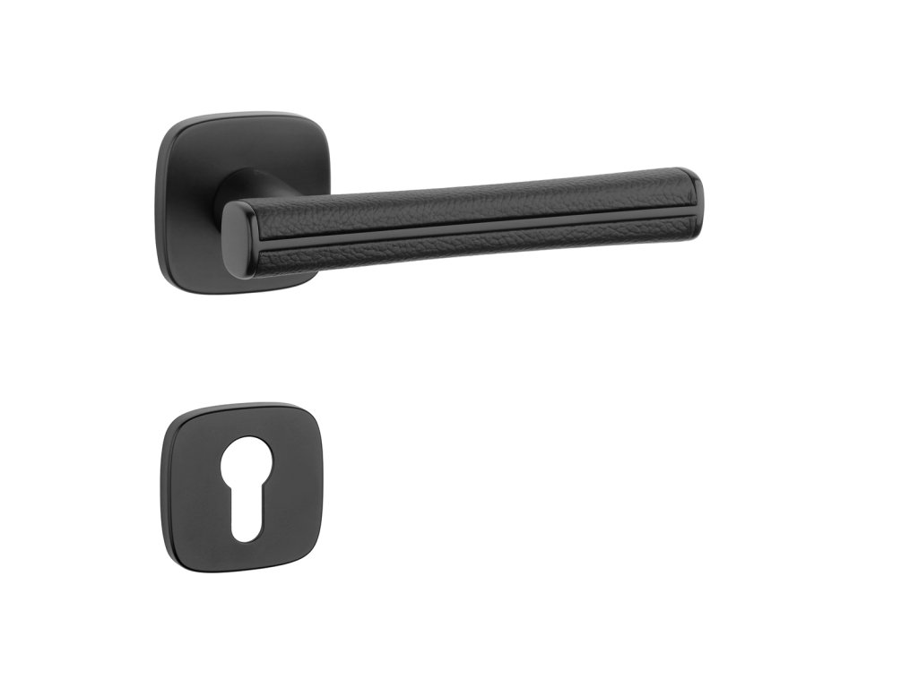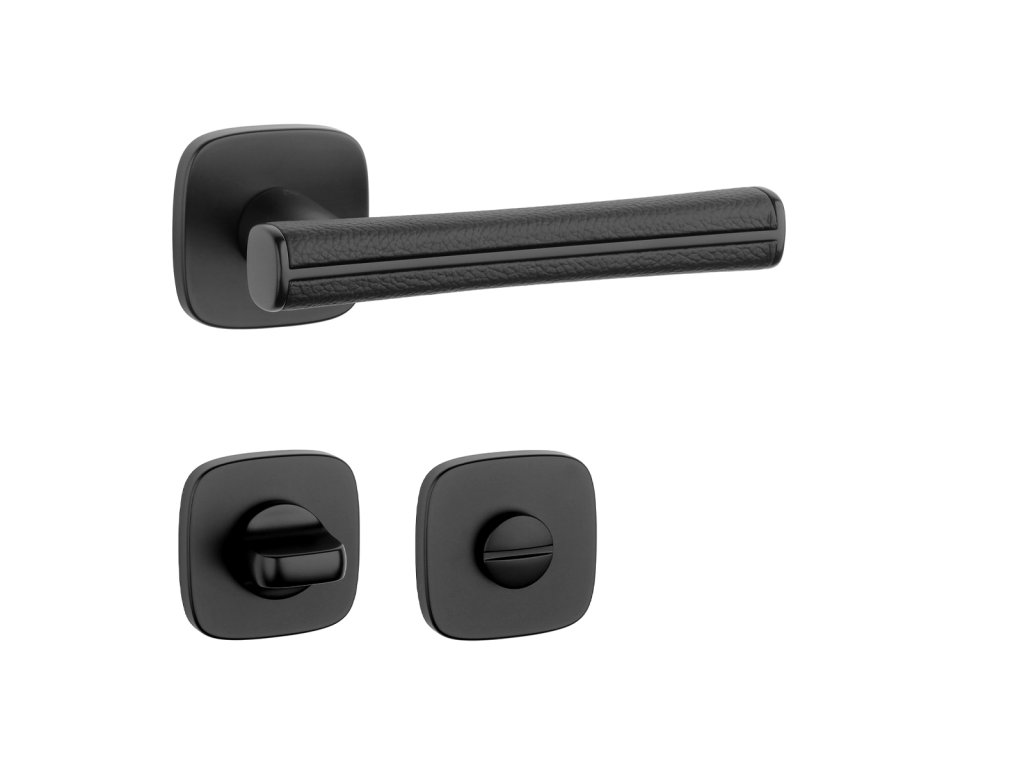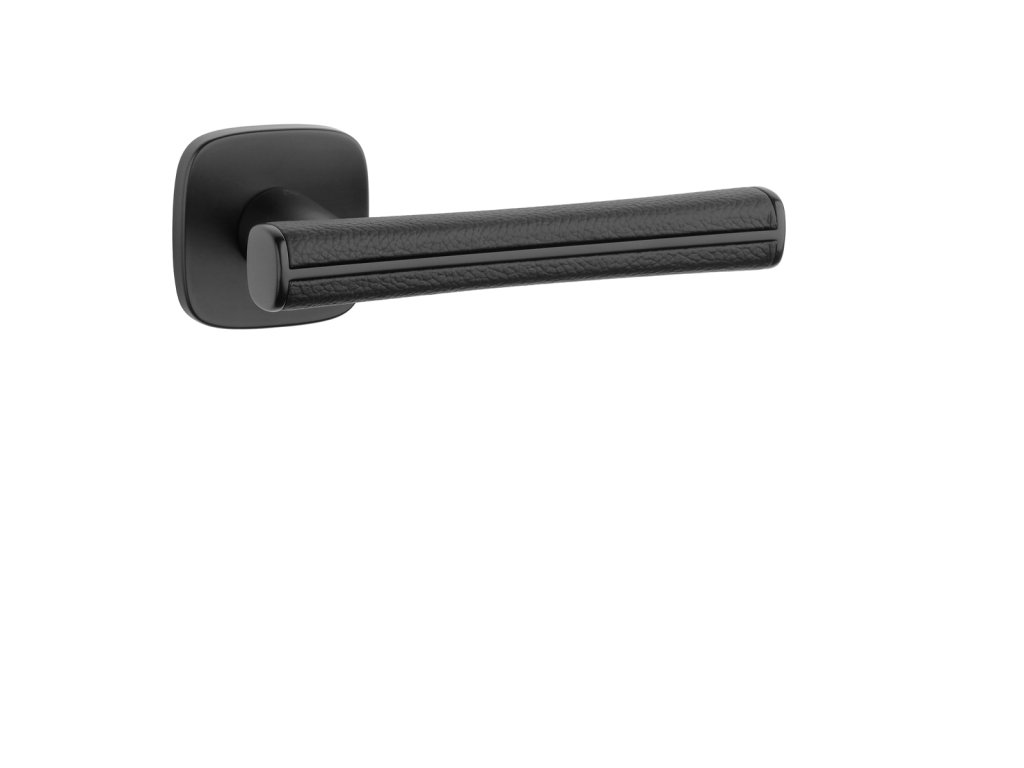 Rozetová kľučka na interiérové dvere s hranatou oblou rozetou je vyrobená z materiálov vysokej kvality - zamak a je povrchovo upravená. Špeciálny efekt vytvára čierna koža, ktorá obopína rukoväť kľučky.