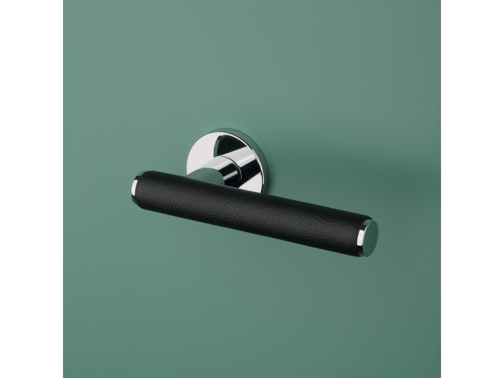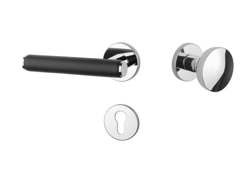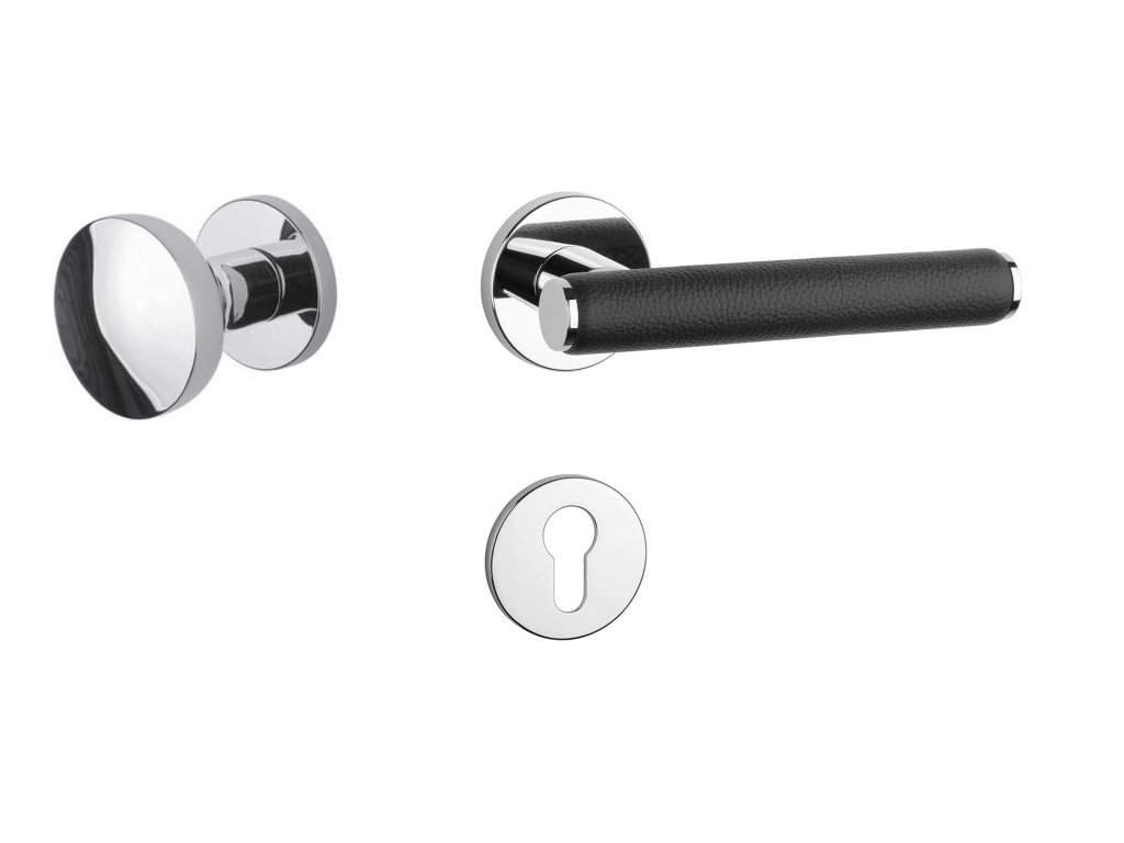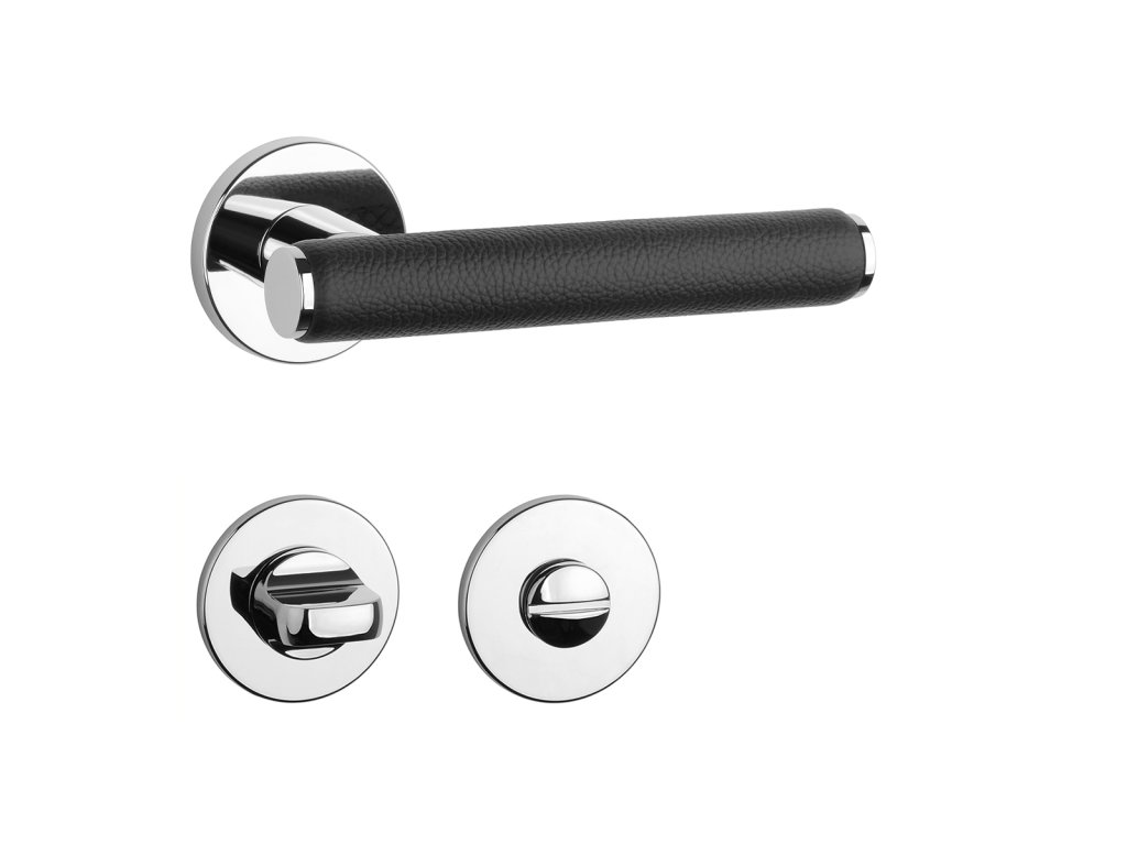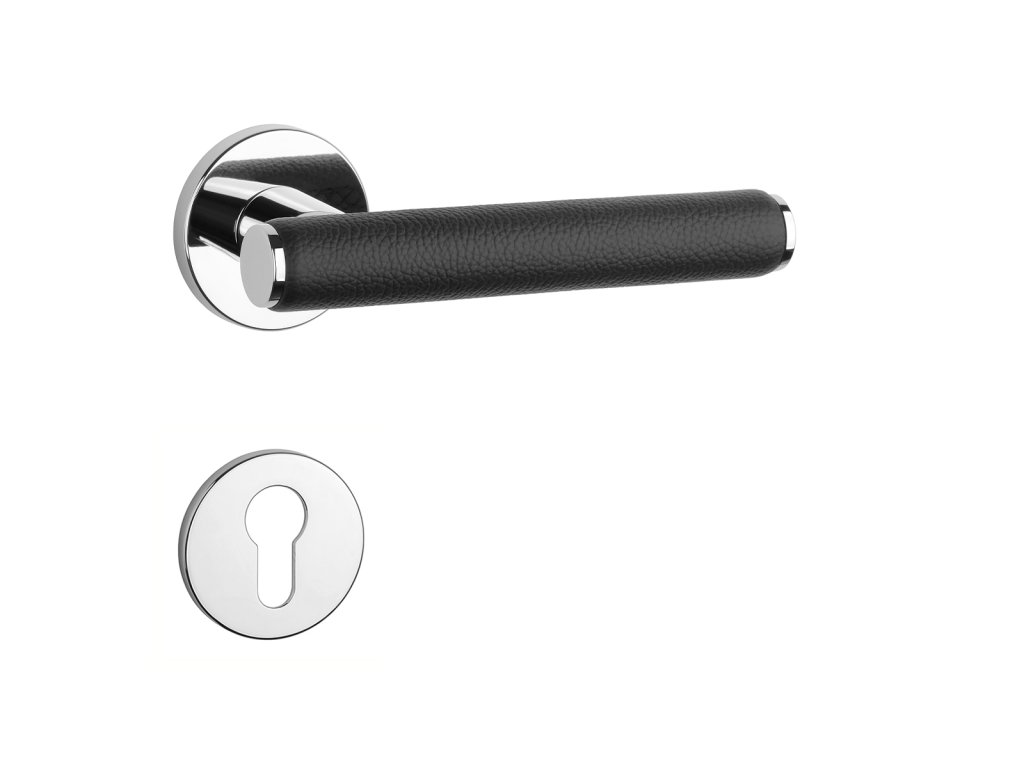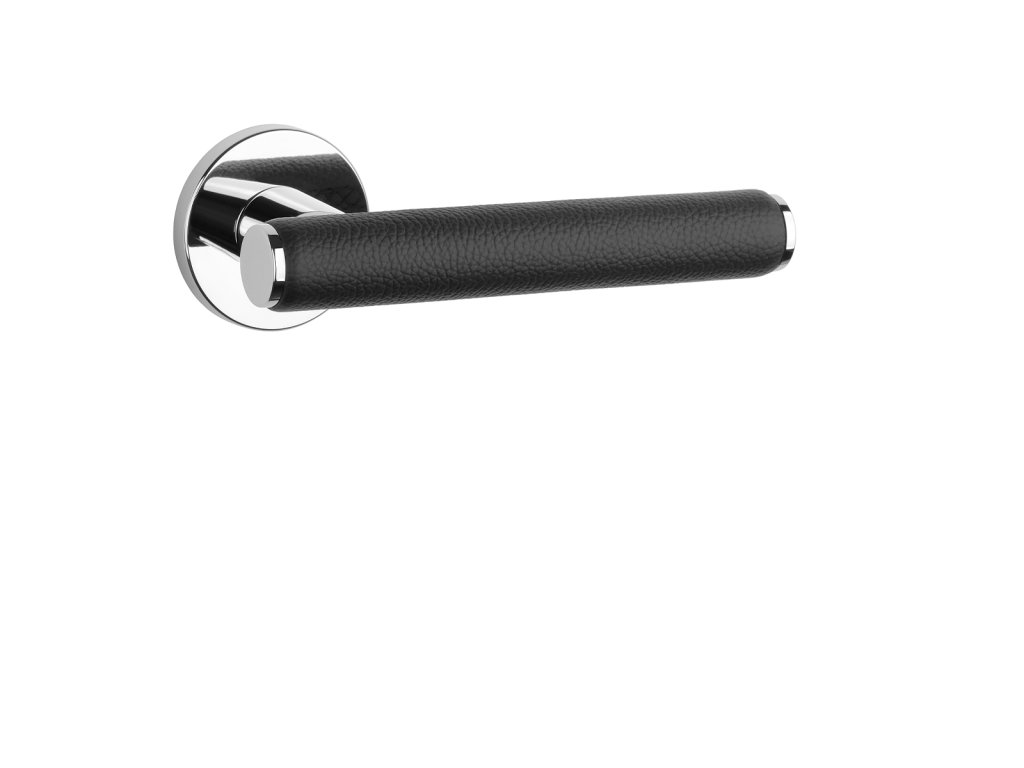 Rozetová kľučka na interiérové dvere s okrúhlou rozetou je vyrobená z materiálov vysokej kvality - zamak a je povrchovo upravená. Zaujímavým prvkom je čierna koža, ktorá obopína rukoväť kľučky.