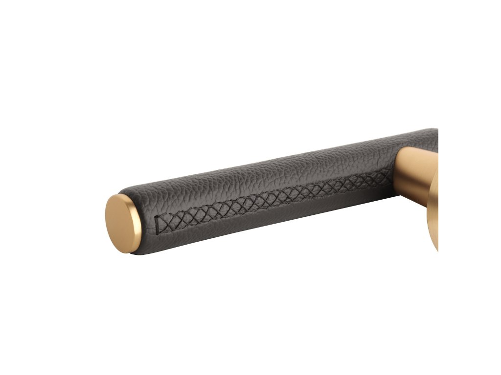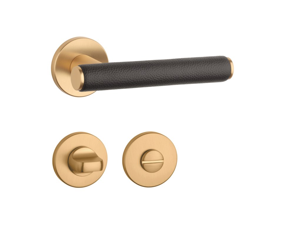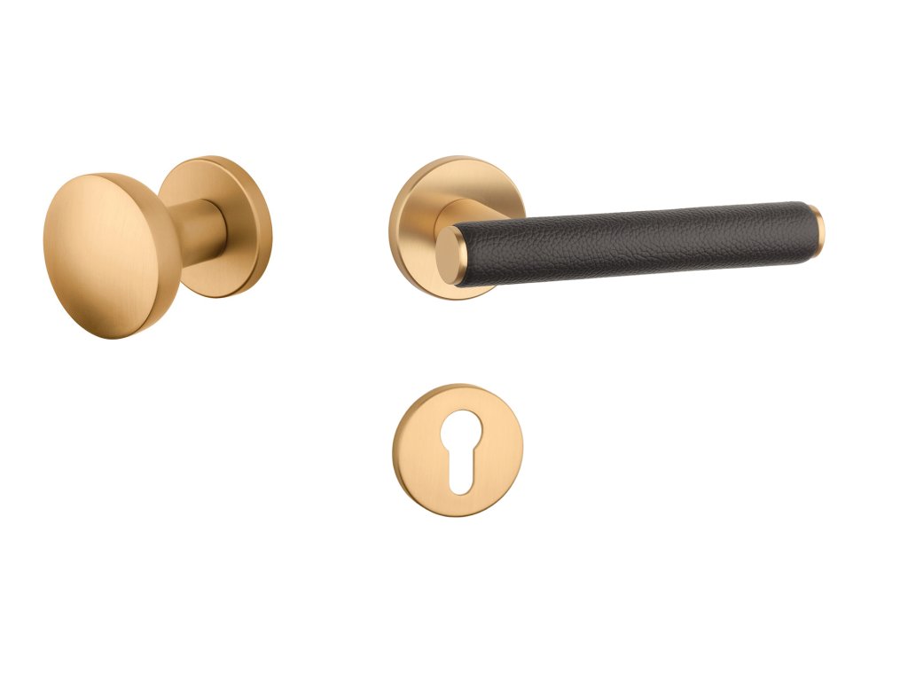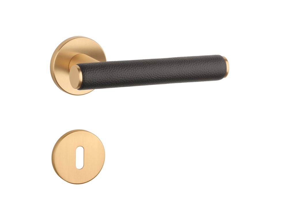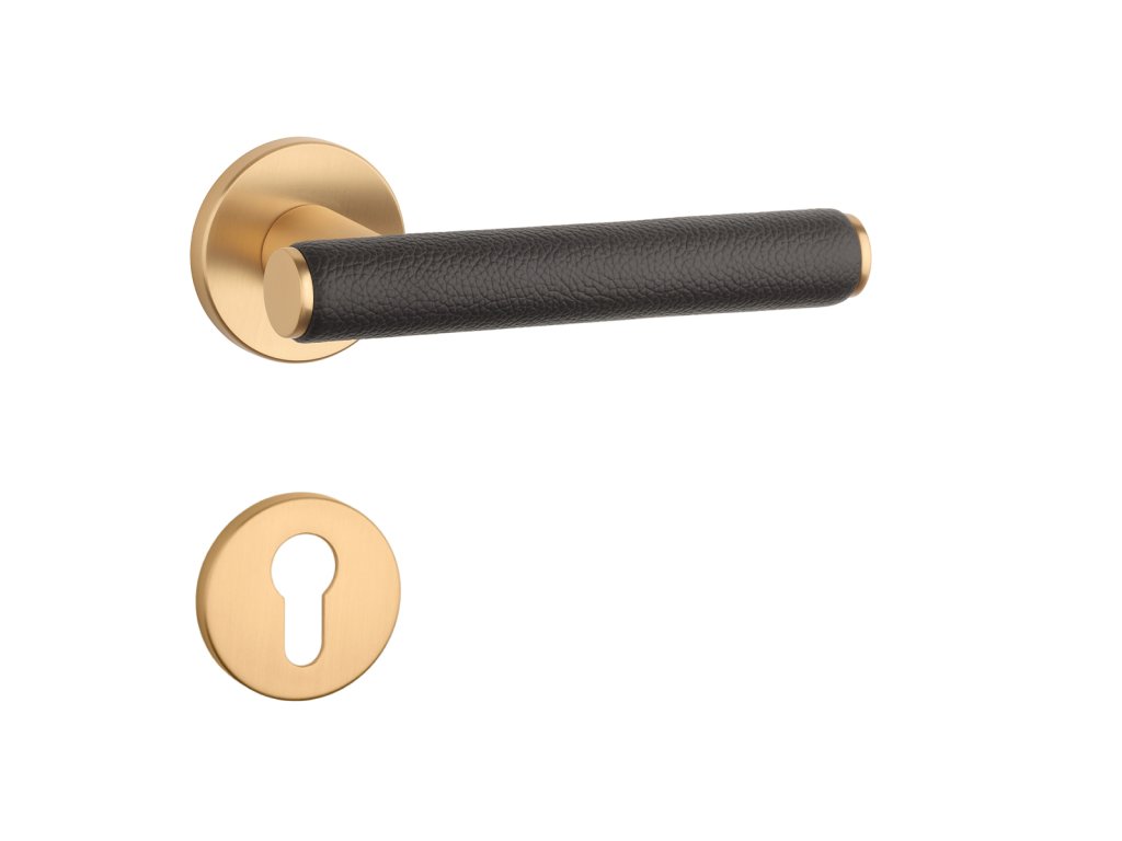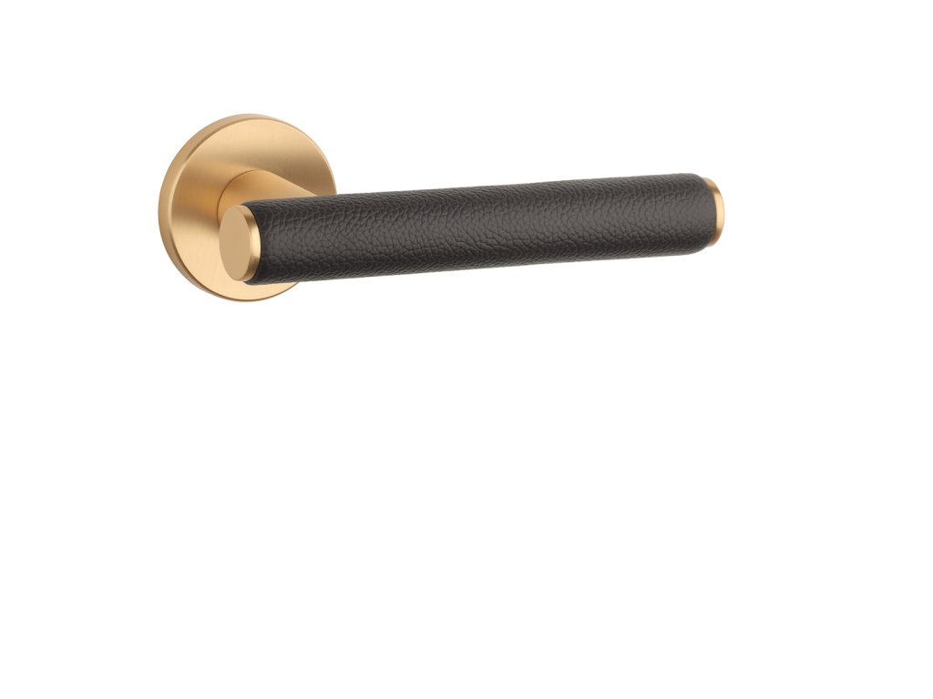 Rozetová kľučka na interiérové dvere s okrúhlou rozetou je vyrobená z materiálov vysokej kvality - zamak a je povrchovo upravená. Zaujímavým prvkom je hnedá koža, ktorá obopína rukoväť kľučky.