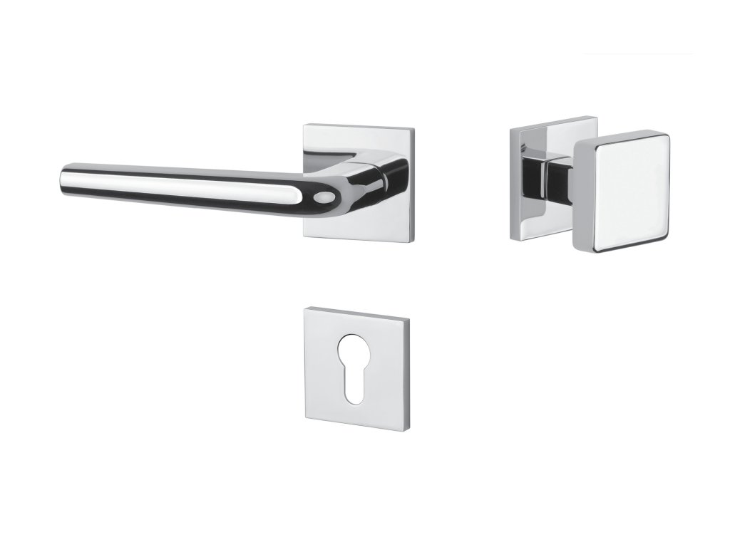 Rozetová kľučka na interiérové dvere s hranatou rozetou je vyrobená z materiálov vysokej kvality- zamak a je povrchovo upravená