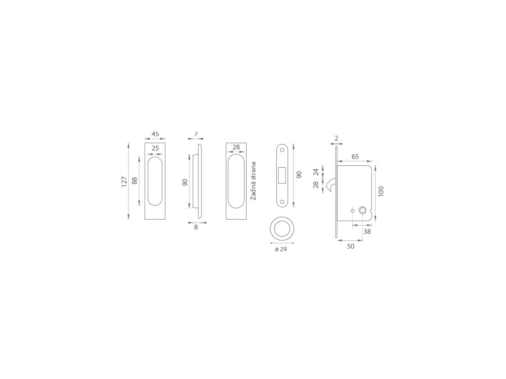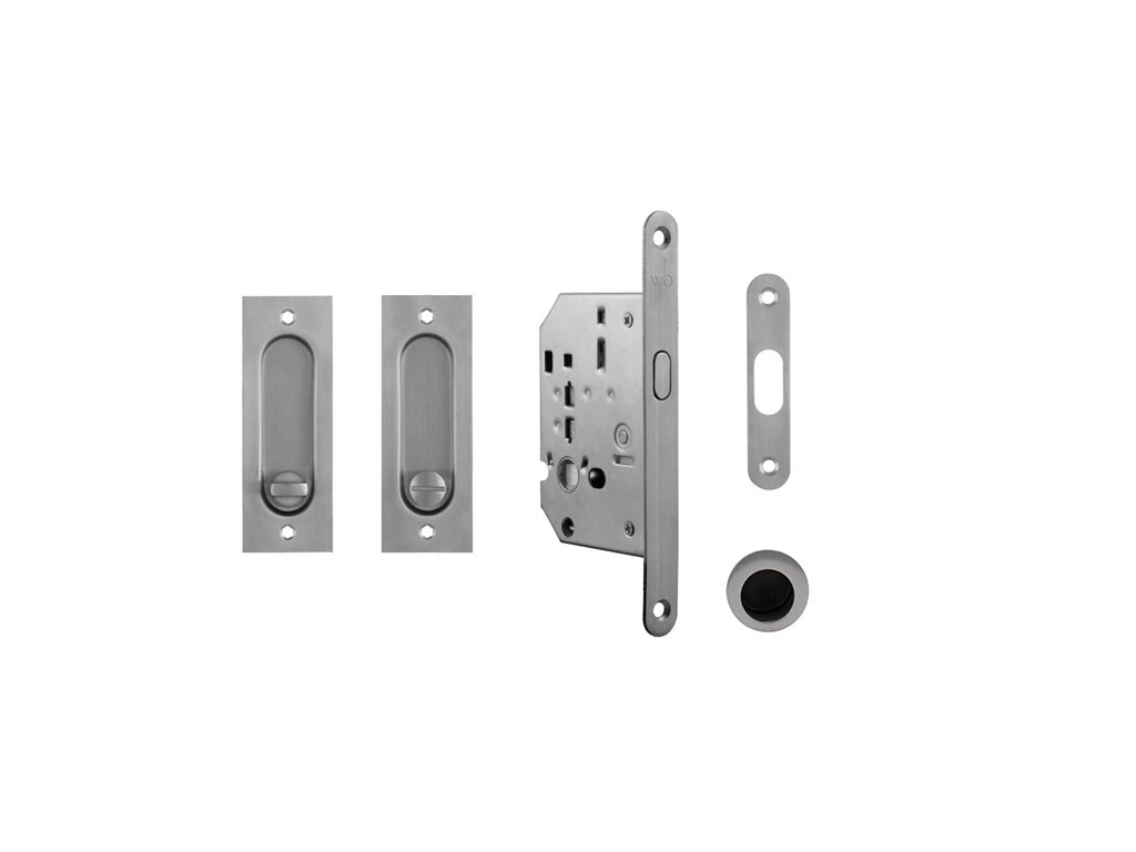 Hranatý set na posuvné dvere s WC kľúčom. WC set obsahuje: zámok, pár mušlí, madielko do čela posuvných dverí.Dodatočné parametre