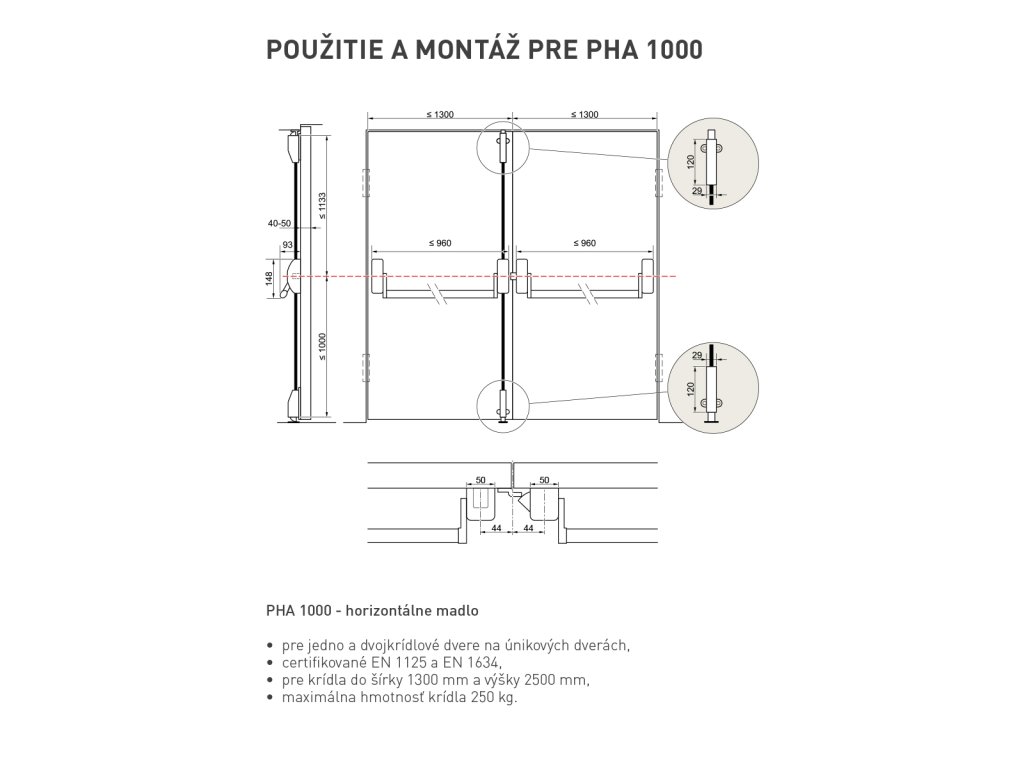 SET pre šírku dverného krídla 1300 mm a výšku do 2500 mm obsahuje: ● PHA 1202 - 2 - bodové vertikálne uzamykanie● certifikované EN 1125 a EN 1634● maximálna hmotnosť krídla 250 kg POUŽITIE PANIKOVÝCH KOVANÍ: Panikové kovania umožňujú otvorenie dverí primeraným zatlačením na madlo v smere úniku a to i v prípade, že sú dvere z vonkajšej strany uzamknuté.Sú určené na použitie na dverách východov z verejných budov s vyššou frekvenciou pohybu ľudí, napr. nákupné strediská, školy, nemocnice, divadlá, kiná, úrady a pod.Tieto kovania sa montujú na dvere, ktoré sú súčasťou núdzových východov a protipožiarnych únikových ciest.Dodatočné parametre