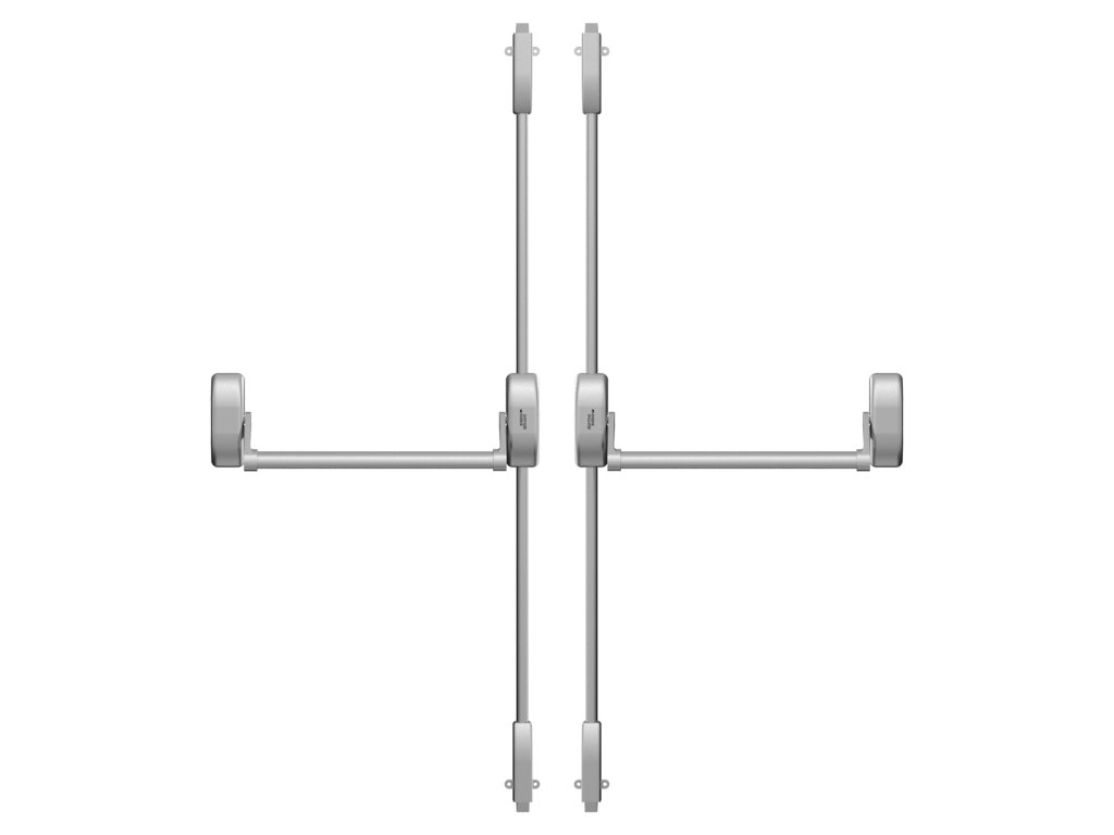 Dvojkrídlové dvere so štvorbodovým zaistením D2/ 2H-2D – 4-bodové vertikálne uzamykanie, je nutné použiť koordinátory zatvárania a samozatvárač, sú určené pre protipožiarne a dymotesné dvere. Podľa šírky dverného krídla a maximálnej výšky si môžete vybrať z nižšie uvedených setov: 1. set D2/2H-2D pre šírku dverného krídla do 1 000 mm s max. výškou 2 270 mm obsahuje: Stojace aj pohyblivé krídlo PHA 2102 F - 1-bodové zaistenie PHA 2104 - paniková tyč 830 mm PHX 04 F - set závory s krytom pre krídlo dverí s výškou do 2 270 mm PHX 03 F - horné a dolné zaistenie 2. set D2/2H-2D pre šírku dverného krídla do 1 300 mm s max. výškou 2 270 mm obsahuje: Stojace aj pohyblivé krídlo PHA 2102 F - 1-bodové zaistenie PHA 2105 - paniková tyč 1 130 mm PHX 04 F - set závory s krytom pre krídlo dverí s výškou do 2 270 mm PHX 03 F - horné a dolné zaistenie 3. set D2/2H-2D pre šírku dverného krídla do 1 000 mm s max. výškou 3 400 mm obsahuje: Stojace aj pohyblivé krídlo PHA 2102 F - 1-bodové zaistenie PHA 2104 - paniková tyč 830 mm PHX 05 F - set závory s krytom pre krídlo dverí s výškou do 3 400 mm PHX 03 F - horné a dolné zaistenie 4. set D2/2H-2D pre šírku dverného krídla do 1 300 mm s max. výškou 3 400 mm obsahuje: Stojace aj pohyblivé krídlo PHA 2102 F - 1-bodové zaistenie PHA 2105 - paniková tyč 1130 mm PHX 05 F - set závory s krytom pre krídlo dverí s výškou do 3 400 mm PHX 03 F - horné a dolné zaistenie Všetky komponenty majú striebornú povrchovú úpravu. POUŽITIE PANIKOVÝCH KOVANÍ: Panikové kovania umožňujú otvorenie dverí primeraným zatlačením na madlo v smere úniku a to i v prípade, že sú dvere z vonkajšej strany uzamknuté.Sú určené na použitie na dverách východov z verejných budov s vyššou frekvenciou pohybu ľudí, napr. nákupné strediská, školy, nemocnice, divadlá, kiná, úrady a pod.Tieto kovania sa montujú na dvere, ktoré sú súčasťou núdzových východov a protipožiarnych únikových ciest.Dodatočné parametre