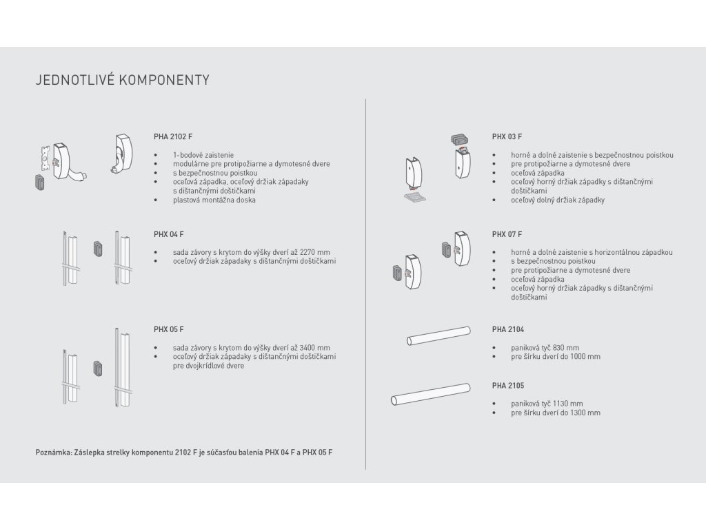 Jednokrídlové dvere s trojbodovým zaistením s bočnou západkou D1/ 3B – 3-bodové horizontálne uzamykanie, je nutné použiť samozatvárač a sú určené pre protipožiarne a dymotesné dvere. Podľa šírky dverného krídla a maximálnej výšky si môžete vybrať z nižšie uvedených setov: 1. set D1/3B pre šírku dverného krídla do 1 000 mm s max. výškou 2 270 mm obsahuje: PHA 2102 F - 1-bodové zaistenie PHA 2104 - paniková tyč 830 mm PHX 04 F - set závory s krytom pre krídlo dverí s výškou do 2 270 mm PHX 07 F - horné a dolné zaistenie s bočnou západkou 2. set D1/3B pre šírku dverného krídla do 1 300 mm s max. výškou 2 270 mm obsahuje: PHA 2102 F - 1-bodové zaistenie PHA 2105 - paniková tyč 1 130 mm PHX 04 F - set závory s krytom pre krídlo dverí s výškou do 2 270 mm PHX 07 F - horné a dolné zaistenie s bočnou západkou 3. set D1/3B pre šírku dverného krídla do 1 000 mm s max. výškou 3 400 mm obsahuje: PHA 2102 F - 1-bodové zaistenie PHA 2104 - paniková tyč 830 mm PHX 05 F - set závory s krytom pre krídlo dverí s výškou do 3 400 mm PHX 07 F - horné a dolné zaistenie s bočnou západkou 4. set D1/3B pre šírku dverného krídla do 1 300 mm s max. výškou 3 400 mm obsahuje: PHA 2102 F - 1-bodové zaistenie PHA 2105 - paniková tyč 1 130 mm PHX 05 F - set závory s krytom pre krídlo dverí s výškou do 3 400 mm PHX 07 F - horné a dolné zaistenie s bočnou západkou Všetky komponenty majú striebornú povrchovú úpravu. POUŽITIE PANIKOVÝCH KOVANÍ: Panikové kovania umožňujú otvorenie dverí primeraným zatlačením na madlo v smere úniku a to i v prípade, že sú dvere z vonkajšej strany uzamknuté.Sú určené na použitie na dverách východov z verejných budov s vyššou frekvenciou pohybu ľudí, napr. nákupné strediská, školy, nemocnice, divadlá, kiná, úrady a pod.Tieto kovania sa montujú na dvere, ktoré sú súčasťou núdzových východov a protipožiarnych únikových ciest.Dodatočné parametre