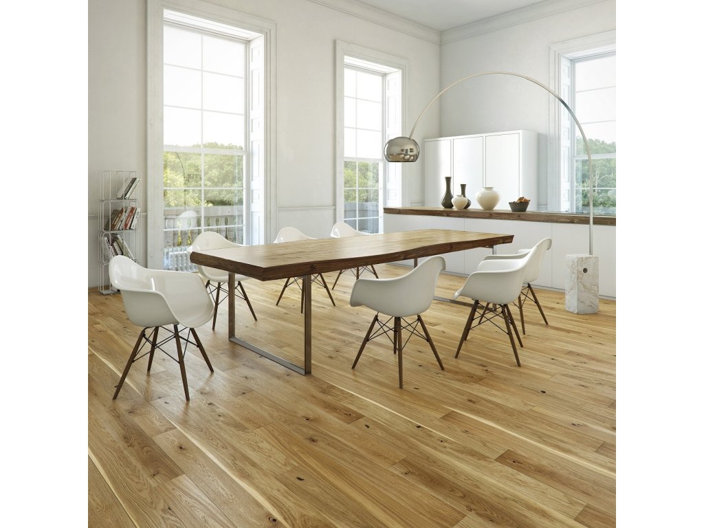 Podlaha z kolekcie Pure Wood je trojvrstvová drevená parketa s vrchnou dubovou vrstvou, kartáčovaným povrchom a povrchovou úpravou prírodným olejom. Celková hrúbka je 14 mm, lamela má rozmery 2200 × 180 mm a nášľapná (horná) vrstva meria 2,5 mm. Podlaha je 1-lamelová, s fazovaním 4V po všetkých stranách, čo vytvára viditeľné škáry medzi lamelami.