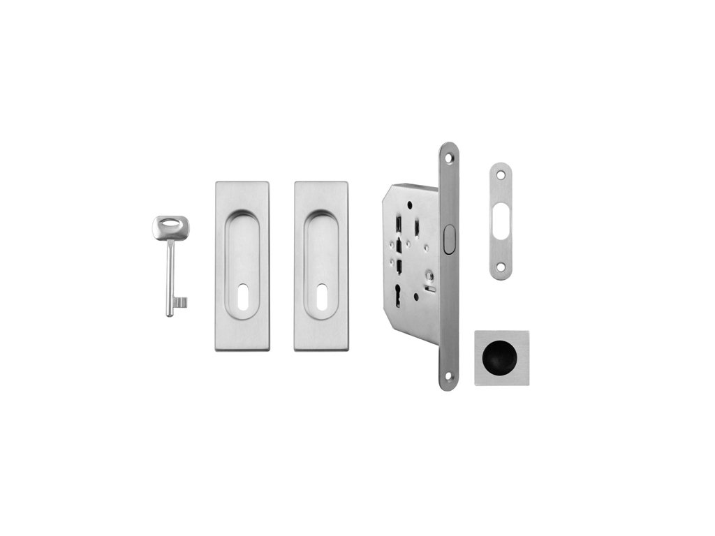 Hranatý set na posuvné dvere s otvorom pre interiérový kľúč (BB) s rozmermi čela zámku v dĺžke 160 mm, šírke 18 mm, hrúbke 2 mm. Rozteč (vzdialenosť medzi otvorom na kľučku a vložkou/kľúčom) - 70 mm , zádlab - 65 mm a dormas (vzdialenosť osi kľučky od lišty zámku) - 48 mm. Set obsahuje: zámok - FT - 60/50, pár mušlí - FT - 3663AF, madielko - FT - MQDodatočné parametre