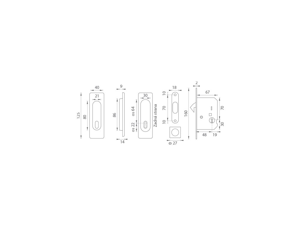 Hranatý set na posuvné dvere s otvorom pre interiérový kľúč (BB) s rozmermi čela zámku v dĺžke 160 mm, šírke 18 mm, hrúbke 2 mm. Rozteč (vzdialenosť medzi otvorom na kľučku a vložkou/kľúčom) - 70 mm , zádlab - 65 mm a dormas (vzdialenosť osi kľučky od lišty zámku) - 48 mm. Set obsahuje: zámok - FT - 60/50, pár mušlí - FT - 3663AF, madielko - FT - MQDodatočné parametre
