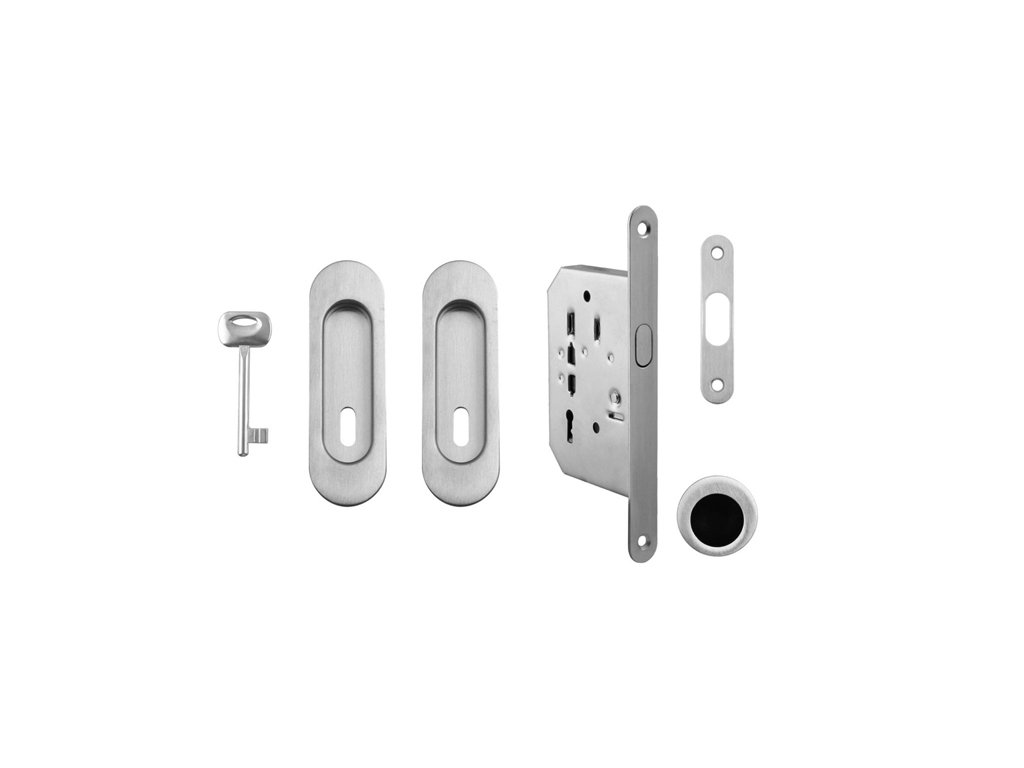 Okrúhly set na posuvné dvere s otvorom pre interiérový kľúč (BB) s rozmermi čela zámku v dĺžke 160 mm, šírke 18 mm, hrúbke 2 mm. Rozteč (vzdialenosť medzi otvorom na kľučku a vložkou/kľúčom) - 70 mm , zádlab - 65 mm a dormas (vzdialenosť osi kľučky od lišty zámku) - 48 mm. Set obsahuje: zámok - FT - 60/50, pár mušlí - FT - 3665AF, madielko - FT - MTDodatočné parametre