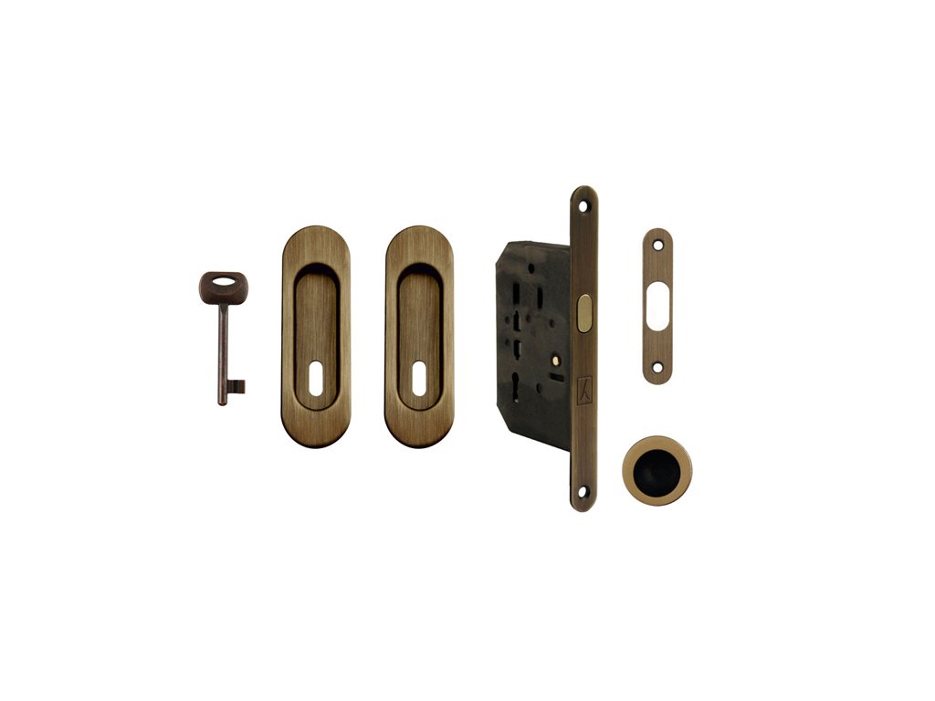 Okrúhly set na posuvné dvere s otvorom pre interiérový kľúč (BB) s rozmermi čela zámku v dĺžke 160 mm, šírke 18 mm, hrúbke 2 mm. Rozteč (vzdialenosť medzi otvorom na kľučku a vložkou/kľúčom) - 70 mm , zádlab - 65 mm a dormas (vzdialenosť osi kľučky od lišty zámku) - 48 mm. Set obsahuje: zámok - FT - 60/50, pár mušlí - FT - 3665AF, madielko - FT - MTDodatočné parametre