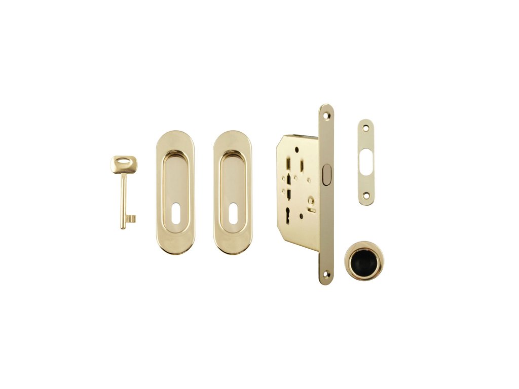 Okrúhly set na posuvné dvere s otvorom pre interiérový kľúč (BB) s rozmermi čela zámku v dĺžke 160 mm, šírke 18 mm, hrúbke 2 mm. Rozteč (vzdialenosť medzi otvorom na kľučku a vložkou/kľúčom) - 70 mm , zádlab - 65 mm a dormas (vzdialenosť osi kľučky od lišty zámku) - 48 mm. Set obsahuje: zámok - FT - 60/50, pár mušlí - FT - 3665AF, madielko - FT - MTDodatočné parametre