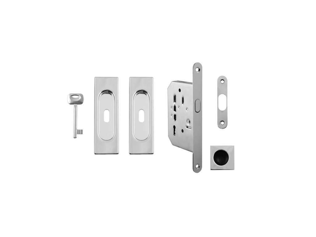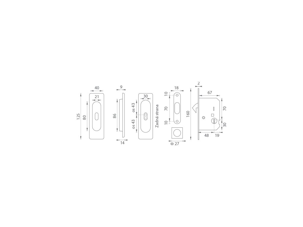 Hranatý set na posuvné dvere s otvorom pre interiérový kľúč (BB) s rozmermi čela zámku v dĺžke 160 mm, šírke 18 mm, hrúbke 2 mm. Rozteč (vzdialenosť medzi otvorom na kľučku a vložkou/kľúčom) - 70 mm , zádlab - 65 mm a dormas (vzdialenosť osi kľučky od lišty zámku) - 48 mm. Set obsahuje: zámok - FT - 60/50, pár mušlí - FT - 3663AF, madielko - FT - MQDodatočné parametre