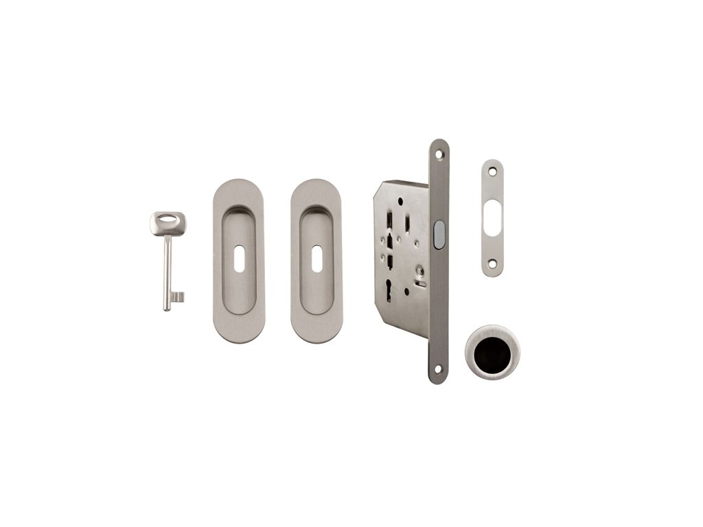 Okrúhly set na posuvné dvere s otvorom pre interiérový kľúč (BB) s rozmermi čela zámku v dĺžke 160 mm, šírke 18 mm, hrúbke 2 mm. Rozteč (vzdialenosť medzi otvorom na kľučku a vložkou/kľúčom) - 70 mm , zádlab - 65 mm a dormas (vzdialenosť osi kľučky od lišty zámku) - 48 mm. Set obsahuje: zámok - FT - 60/50, pár mušlí - FT - 3665AF, madielko - FT - MT Povrchová úprava: nikel brúsený lesklý lakDodatočné parametre