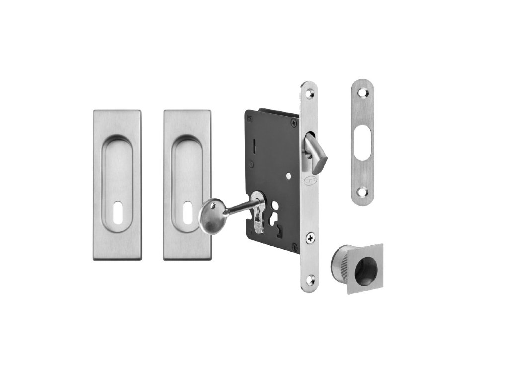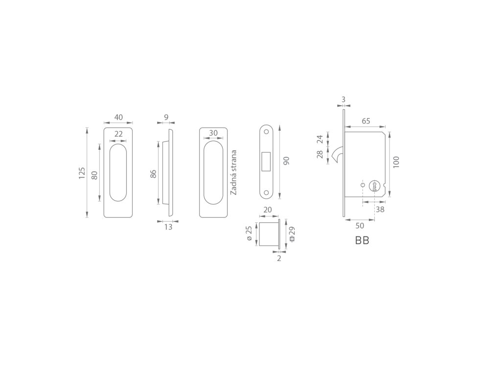 Hranatý set na posuvné dvere s otvorom pre interiérový kľúč (BB). Set obsahuje: zámok JNF - IN.20.923, pár mušlí - FT - 3663AF, madielko ATZ - 3919Dodatočné parametre
