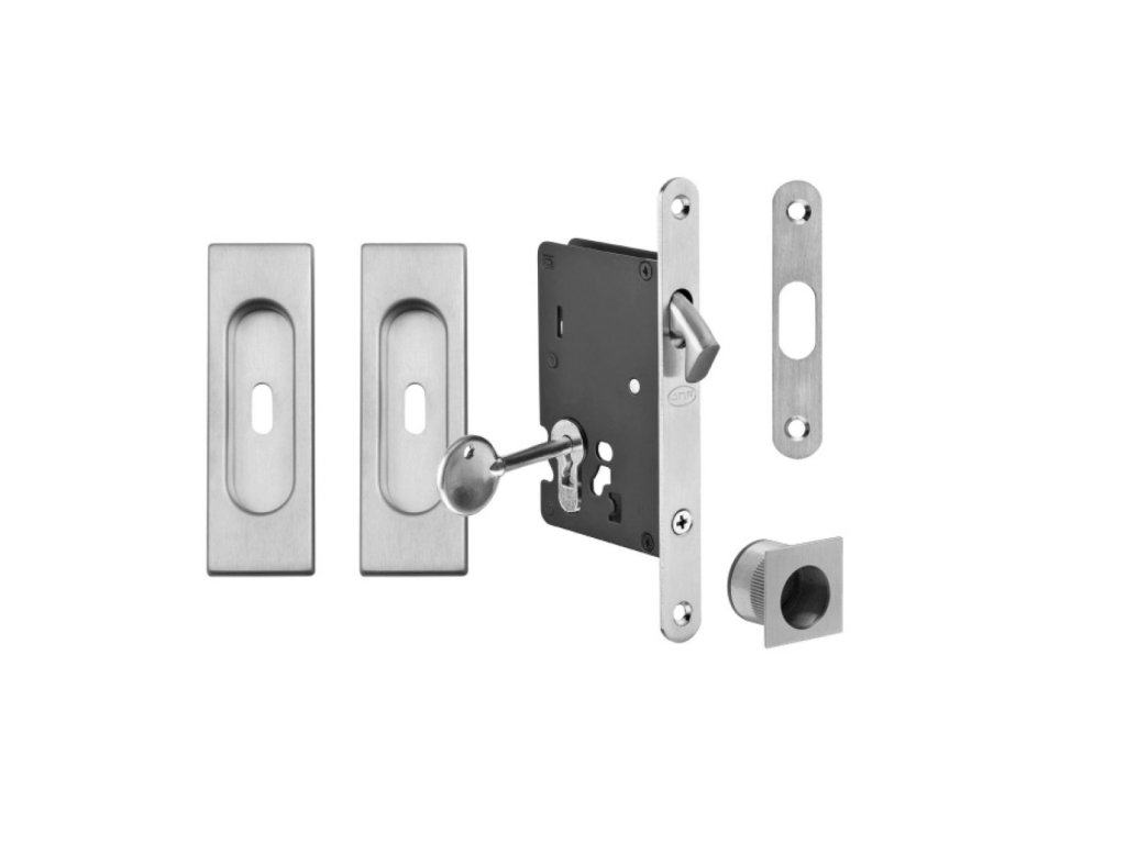 Hranatý set na posuvné dvere s otvorom pre interiérový kľúč (BB). Set obsahuje: zámok JNF - IN.20.922, pár mušlí - FT - 3663AZ, madielko ATZ - 3919Dodatočné parametre