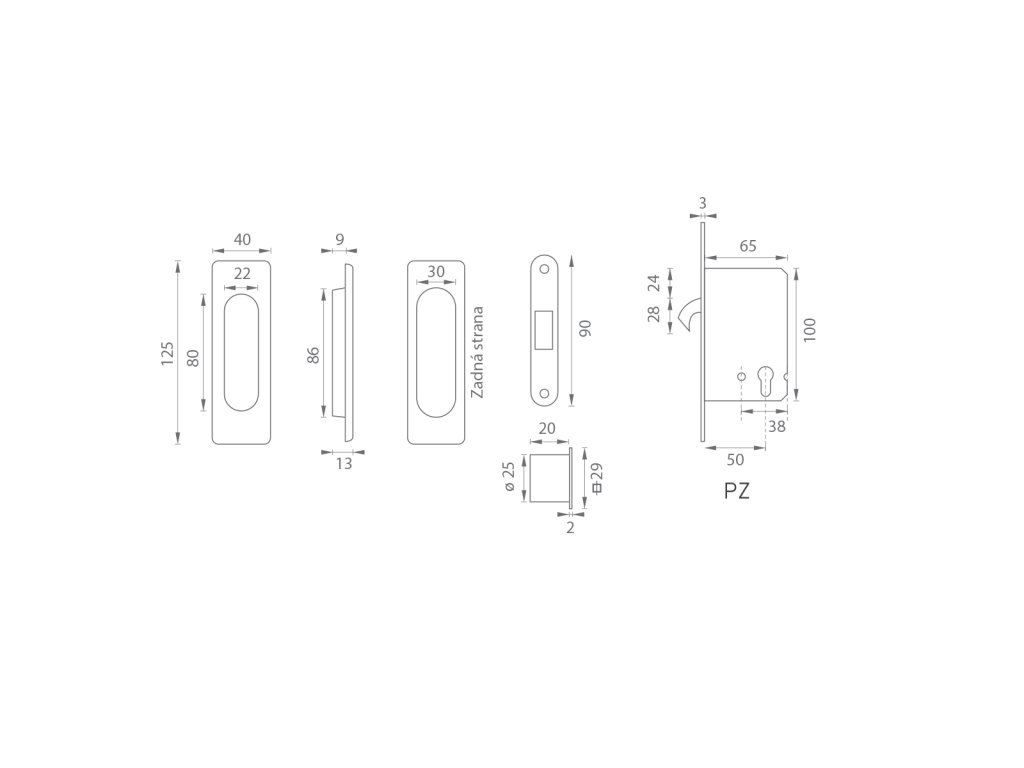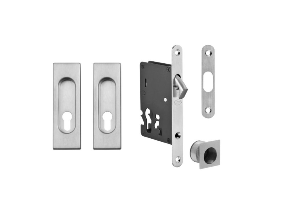 Hranatý set na posuvné dvere s otvorom pre cylindrickú vložku (PZ). Set obsahuje: zámok JNF - IN.20.922, pár mušlí - FT - 3663AZ, madielko ATZ - 3919Dodatočné parametre