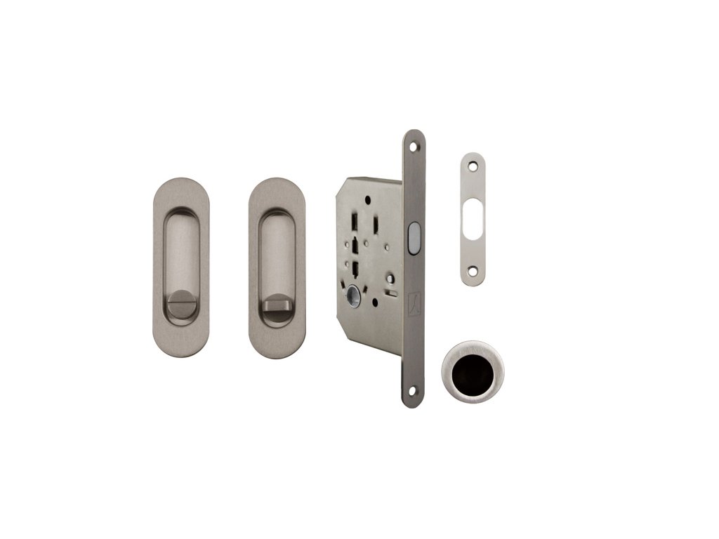 Okrúhly set na posuvné dvere s WC kľúčom s rozmermi čela zámku v dĺžke 160 mm, šírke 18 mm, hrúbke 2 mm. Rozteč (vzdialenosť medzi otvorom na kľučku a vložkou/kľúčom) - 70 mm , zádlab - 65 mm a dormas (vzdialenosť osi kľučky od lišty zámku) - 48 mm. Set obsahuje: zámok - FT - 61/50, pár mušlí - FT - 3665AR, madielko - FT - MT Povrchová úprava: nikel brúsený lesklý lakDodatočné parametre