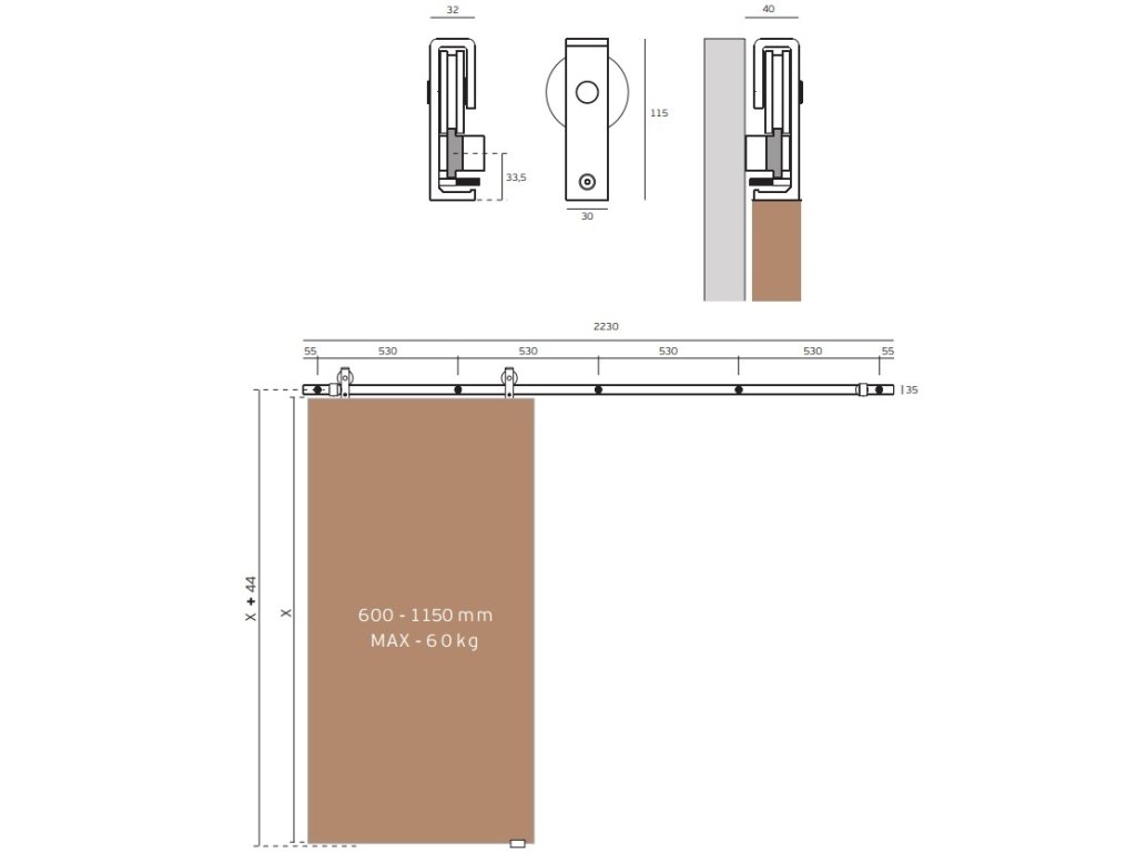 Kovanie pre posuvné drevené dvere od renomovaného portugalského výrobcu JNF. System PS Charriot je určený na drevené dvere šírky 600 - 1150 mm s maximálnou váhou dverného krídla do 60 kg. Drevené dvere nie sú súčasťou posuvného systému. Doplnením posuvného systému o spomaľovače (system soft close) , ktoré sú balené po 2 ks dosiahnete spomaleného otvárania aj zatvárania dverí. Prečo použiť spomaľovač:• tichosť a jemnosť zatvorenia, alebo otvorenia dverí,• prevencia pred poškodením z prudkého zatvárania dverí – predĺženie životnosti dverí,• ochrana detí, starších ľudí a domácich miláčikov pred privretím – bezpečné použitie. Obsah balenia: Vozík - 2 ks Stoper - 2 ks Podlahové vedenie - 1ks Vodiaca koľajnica 2230 mm - 1ks Skrutky M8 x 100mm - 4ks Skrutky 3,5 x 25mm - 2ks Nylónová podložka - 4ks Imbusový kľúč - 2ksDodatočné parametre