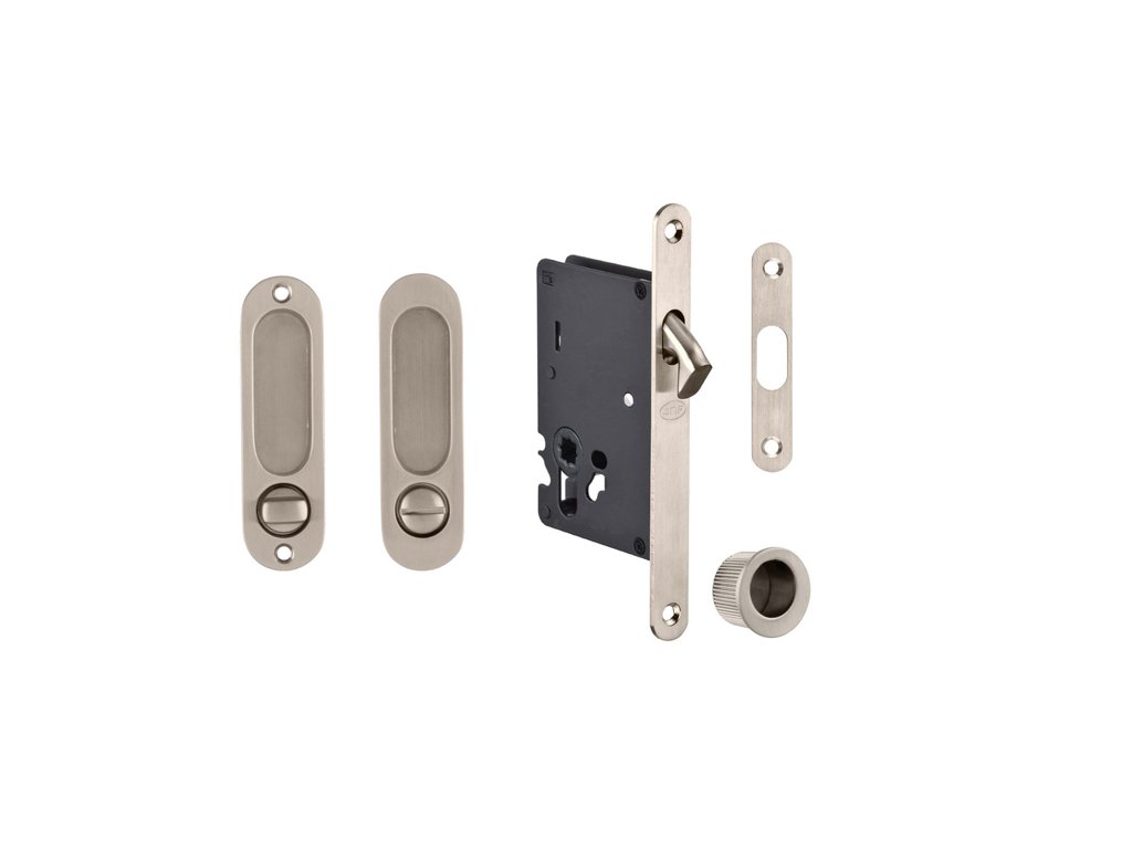 Okrúhly set na posuvné dvere s WC kľúčom - Rozteč (vzdialenosť medzi otvorom na kľučku a vložkou/kľúčom) - 90 mm , zádlab - 65 mm a dormas (vzdialenosť osi kľučky od lišty zámku) - 50 mm. WC set obsahuje: zámok, pár mušlí, madielkoDodatočné parametre