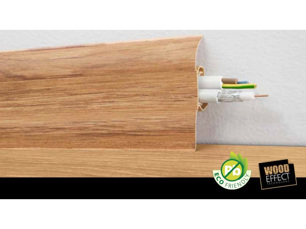 Soklové lišty PVC Arbiton 55 sú vyrobené z polymérového materiálu a majú výšku 55 mm.Lišty obsahujú špeciálny káblový kanál, ktorý umožňuje skryté vedenie káblov za lištou.