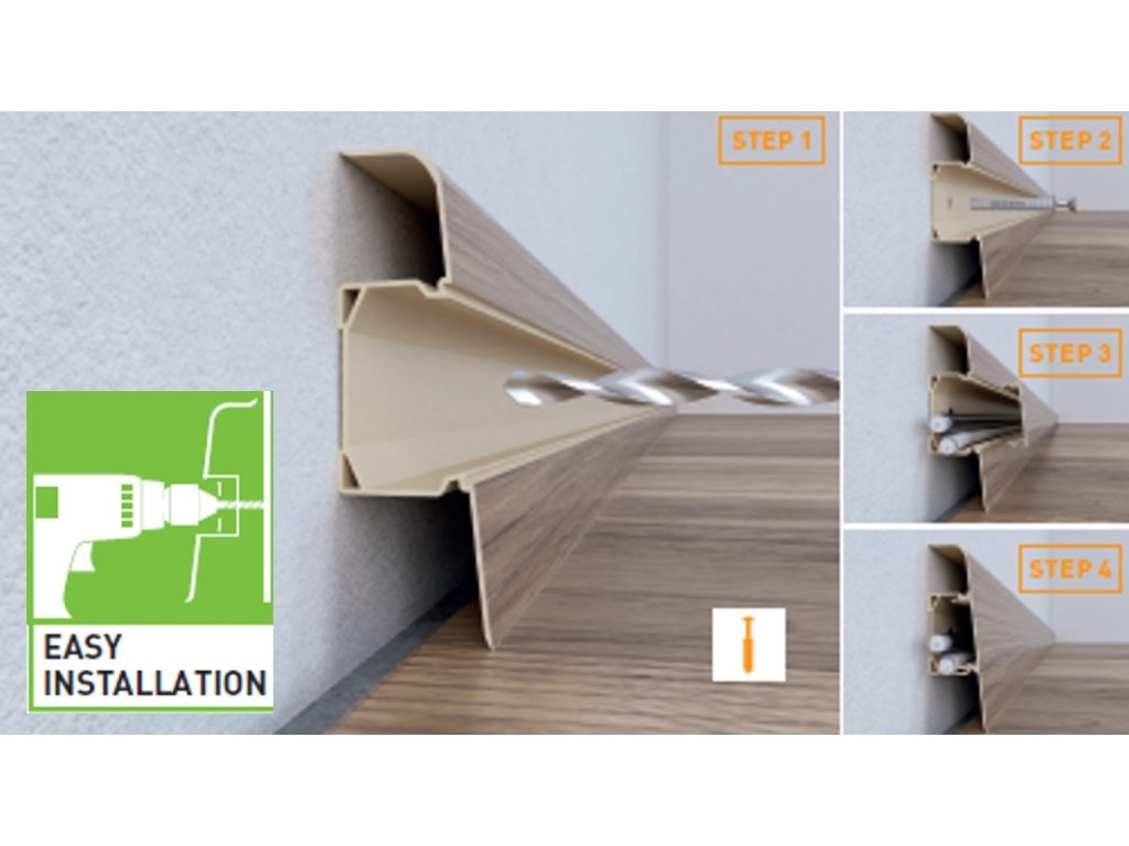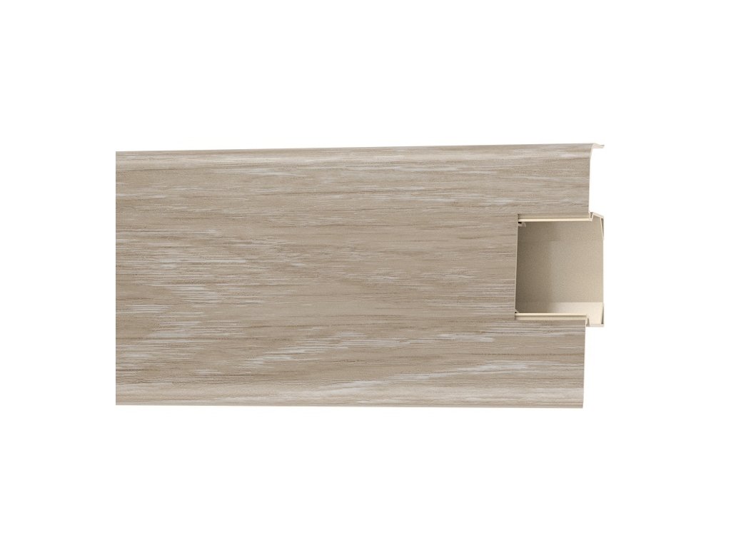 Parketová plastova lišta s výškou 7 cm s dekormi verne imitujúcimi nielen dekor dreva ale aj jeho štruktúru. Jednoduchá montáž vďaka vyberateľnej stredovej časti , ktorá umožňuje dodatočné vloženie a vedenie káblov. Mäkké časti oboch hrán lišty ideálne kopírujú a povrch steny a prekryjú aj mierne nerovnosti .