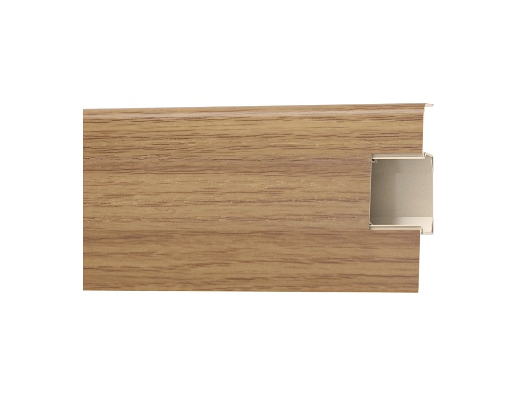 Parketová plastova lišta s výškou 7 cm s dekormi verne imitujúcimi nielen dekor dreva ale aj jeho štruktúru. Jednoduchá montáž vďaka vyberateľnej stredovej časti , ktorá umožňuje dodatočné vloženie a vedenie káblov. Mäkké časti oboch hrán lišty ideálne kopírujú a povrch steny a prekryjú aj mierne nerovnosti .