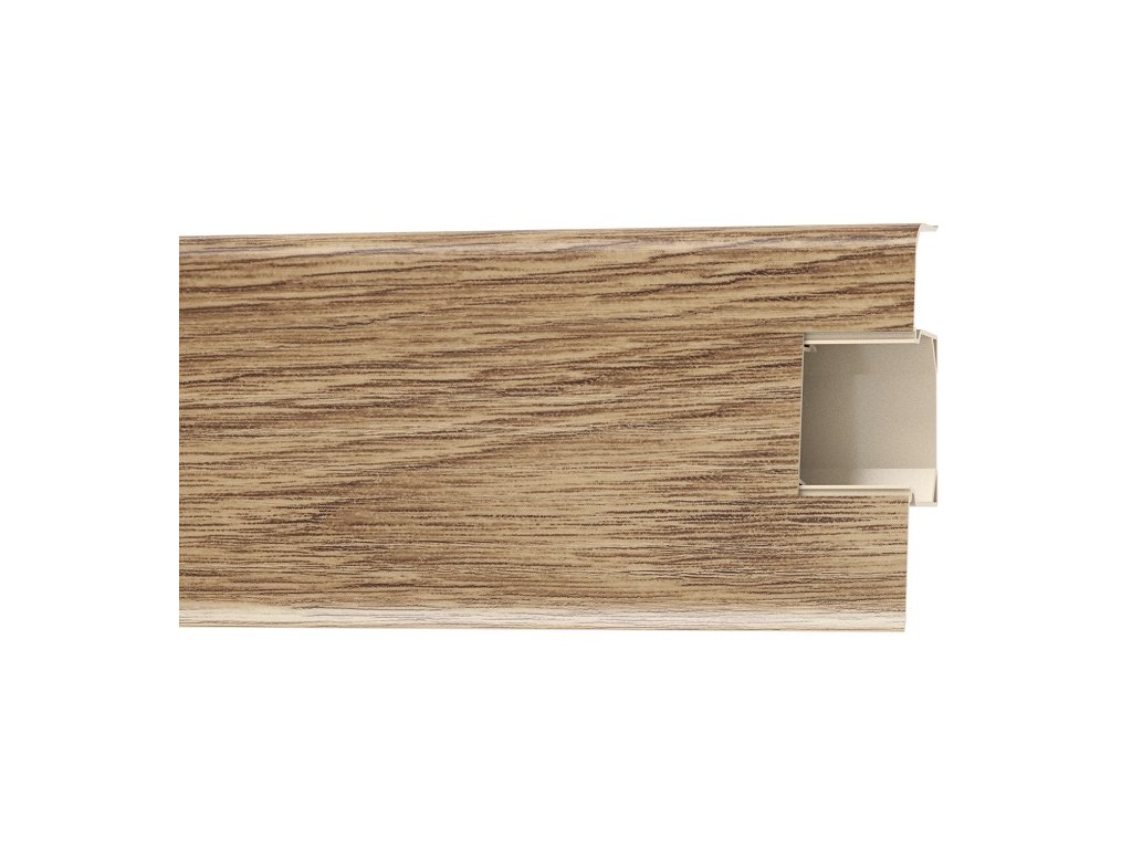 Parketová plastova lišta s výškou 7 cm s dekormi verne imitujúcimi nielen dekor dreva ale aj jeho štruktúru. Jednoduchá montáž vďaka vyberateľnej stredovej časti , ktorá umožňuje dodatočné vloženie a vedenie káblov. Mäkké časti oboch hrán lišty ideálne kopírujú a povrch steny a prekryjú aj mierne nerovnosti .