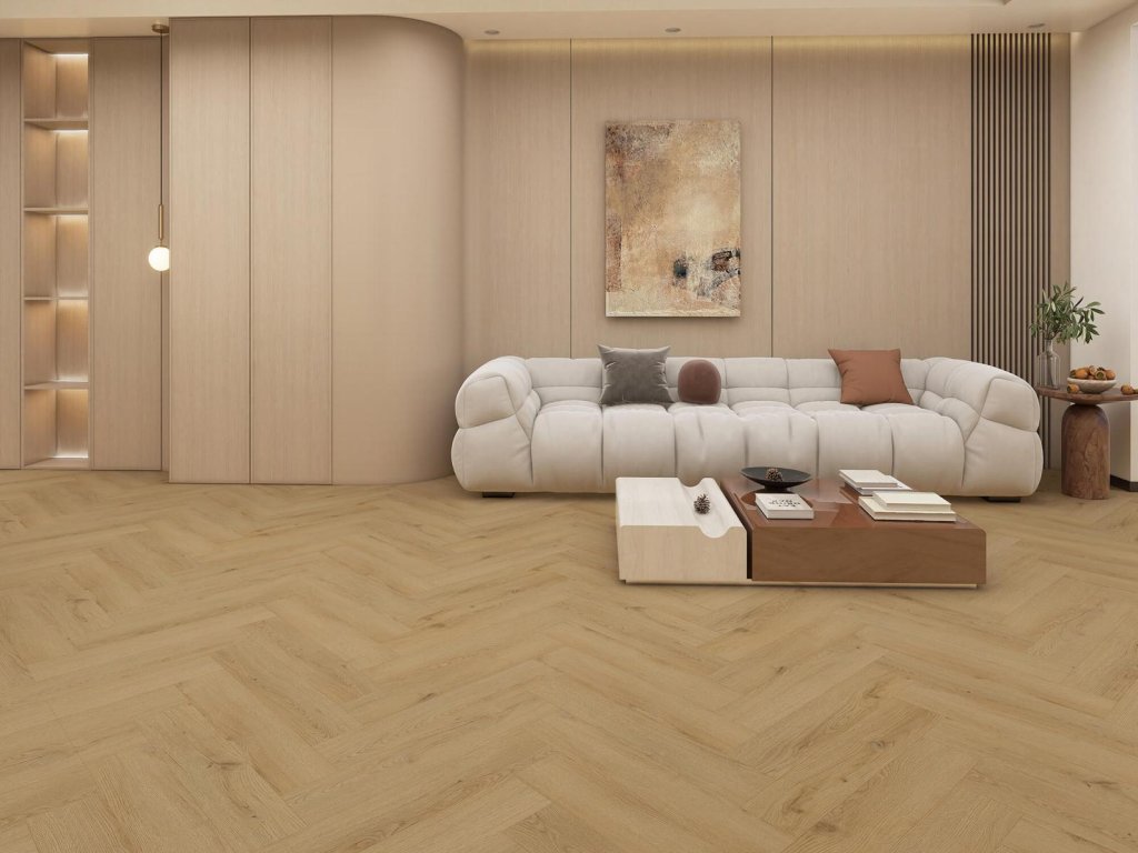 Minerálna kompozitná podlaha META vo vzore Herringbone spája nadčasovú eleganciu dreva s odolnosťou moderných minerálnych kompozitov.