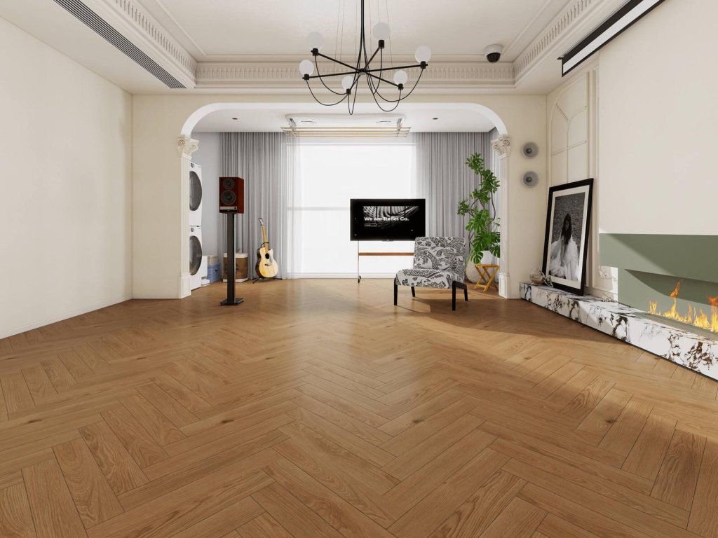 Minerálna kompozitná podlaha META vo vzore Herringbone spája nadčasovú eleganciu dreva s odolnosťou moderných minerálnych kompozitov.