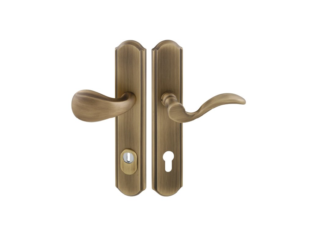 Štítová kľučka na vchodové a bezpečnostné dvere so spevneným rustikálnym štítom s prekrytím cylindrickej vložky je vyrobená z materiálov vysokej kvality – mosadz a je povrchovo upravená.
