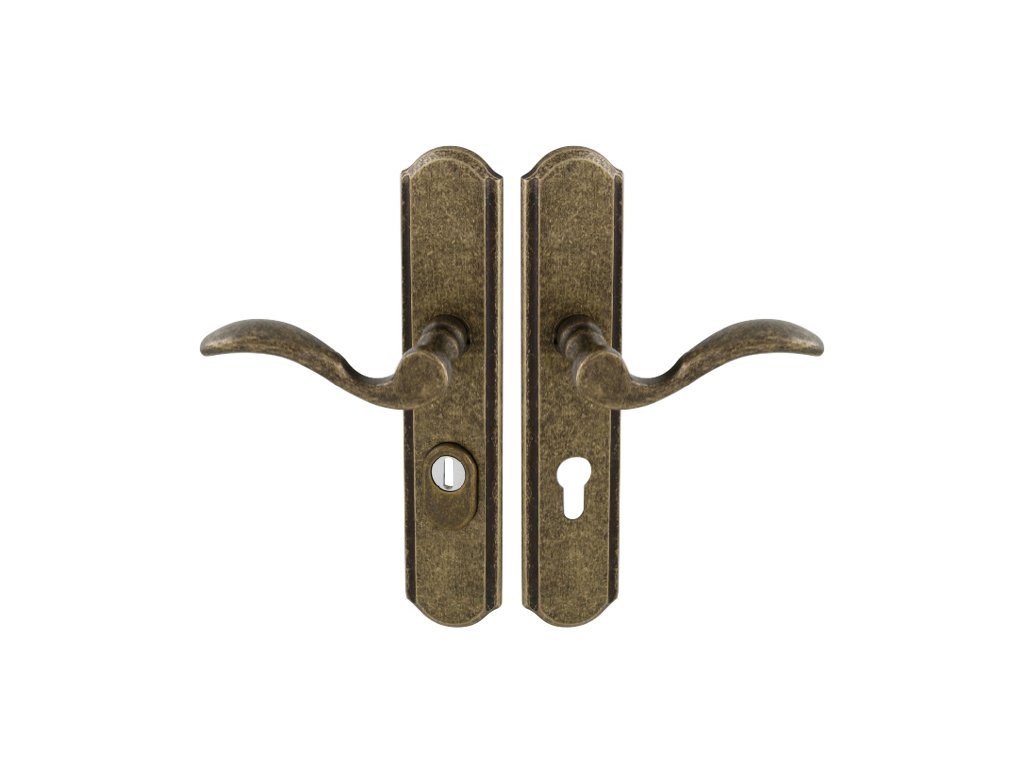 Štítová kľučka na vchodové a bezpečnostné dvere so spevneným rustikálnym štítom s prekrytím cylindrickej vložky je vyrobená z materiálov vysokej kvality – mosadz a je povrchovo upravená.