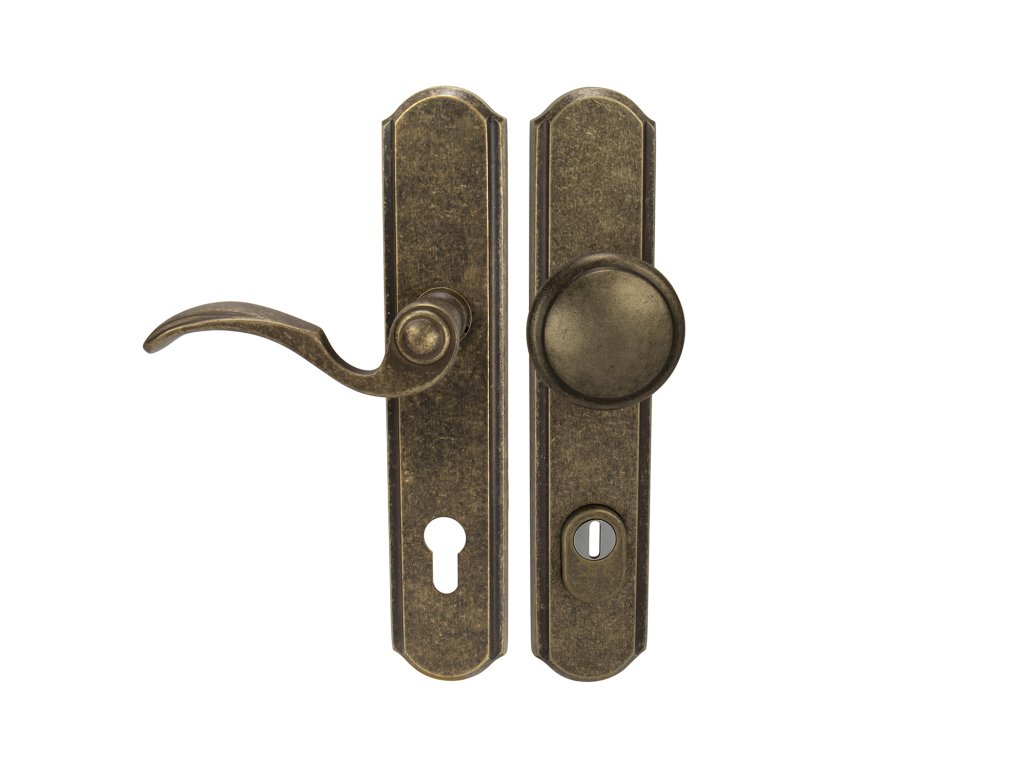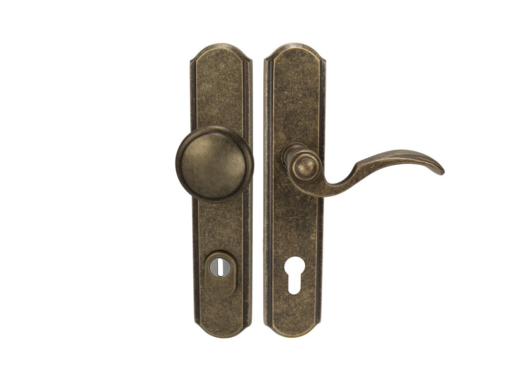 Štítová kľučka na vchodové a bezpečnostné dvere so spevneným rustikálnym štítom s prekrytím cylindrickej vložky je vyrobená z materiálov vysokej kvality – mosadz a je povrchovo upravená.