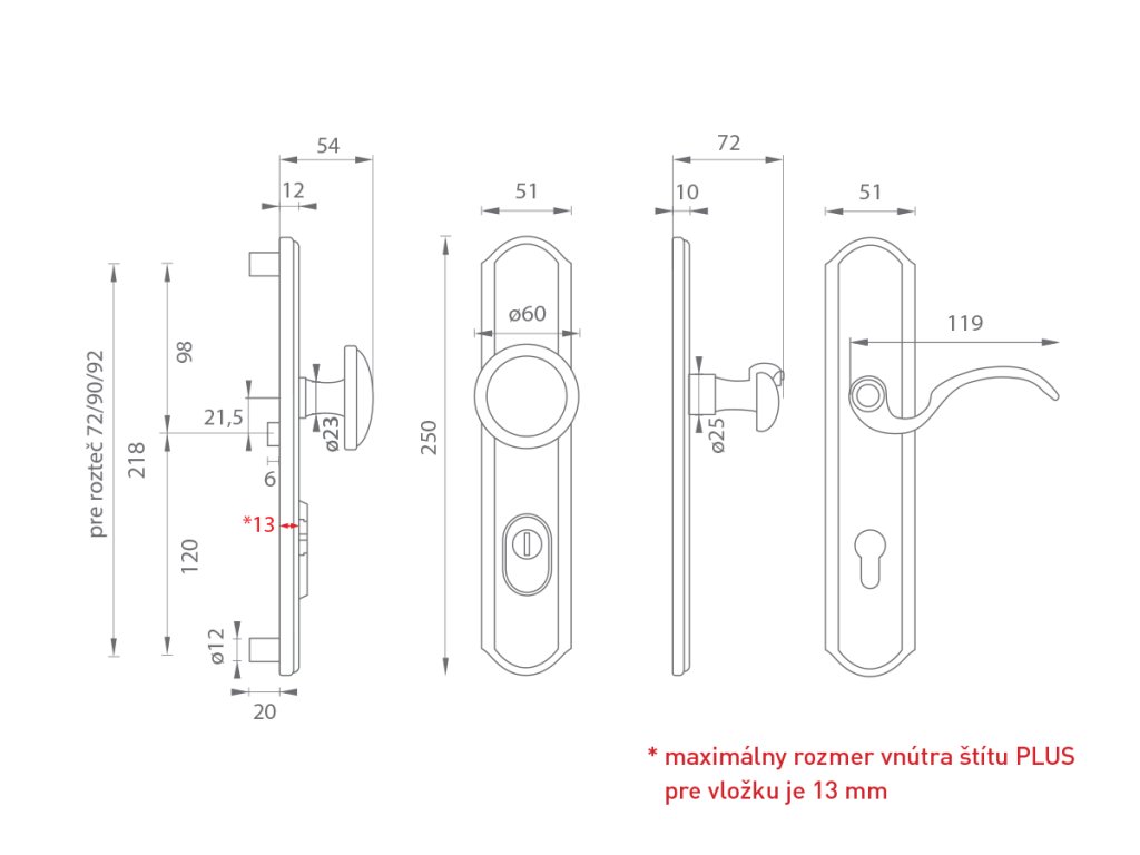 Upozornenie: PLUS označuje prekrytie cylindrickej vložky. Maximálny rozmer vnútra štítu PLUS pre vložku je 13 mm. Pri spevnenom kovaní je potrebné poznať vzdialenosť medzi osou kľučky a osou kľúča (rozteč). Štandardná vzdialenosť je 72, 90 alebo 92 mm. Kovanie s roztečou 72, 90 a 92 mm je štandardom pre hrúbku dverí od 38 mm do 50 mm.