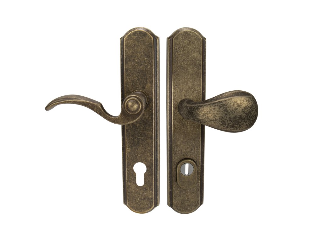 Štítová kľučka na vchodové a bezpečnostné dvere so spevneným rustikálnym štítom s prekrytím cylindrickej vložky je vyrobená z materiálov vysokej kvality – mosadz a je povrchovo upravená.