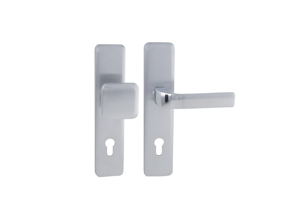 Štítová kľučka na vchodové a bezpečnostné dvere so spevneným hranatým štítom bez prekrytia cylindrickej vložky je vyrobená z materiálov vysokej kvality – mosadz a je povrchovo upravená.