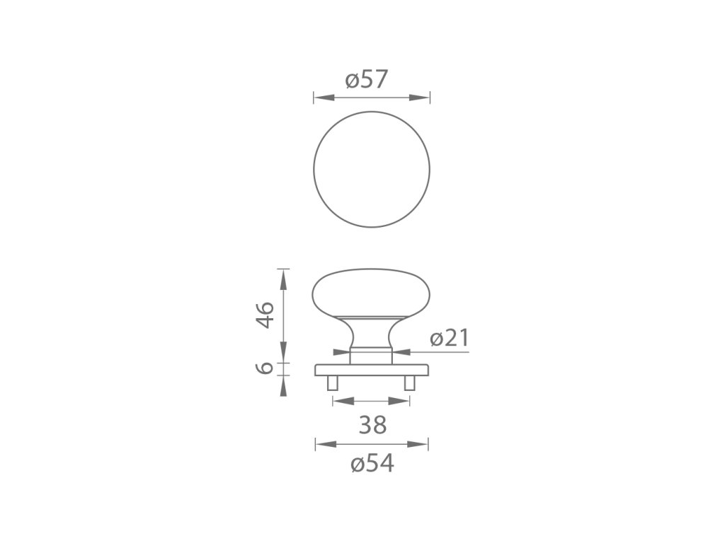 Dverová pevná priama guľa na okrúhlej rozete je vyrobená zo zamaku - zliatiny zinka a hliníka a je povrchovo upravená. Rozmery: Priemer gule: 57 mm Priemer rozety: 54 mm Hrúbka rozety: 6 mmDodatočné parametre