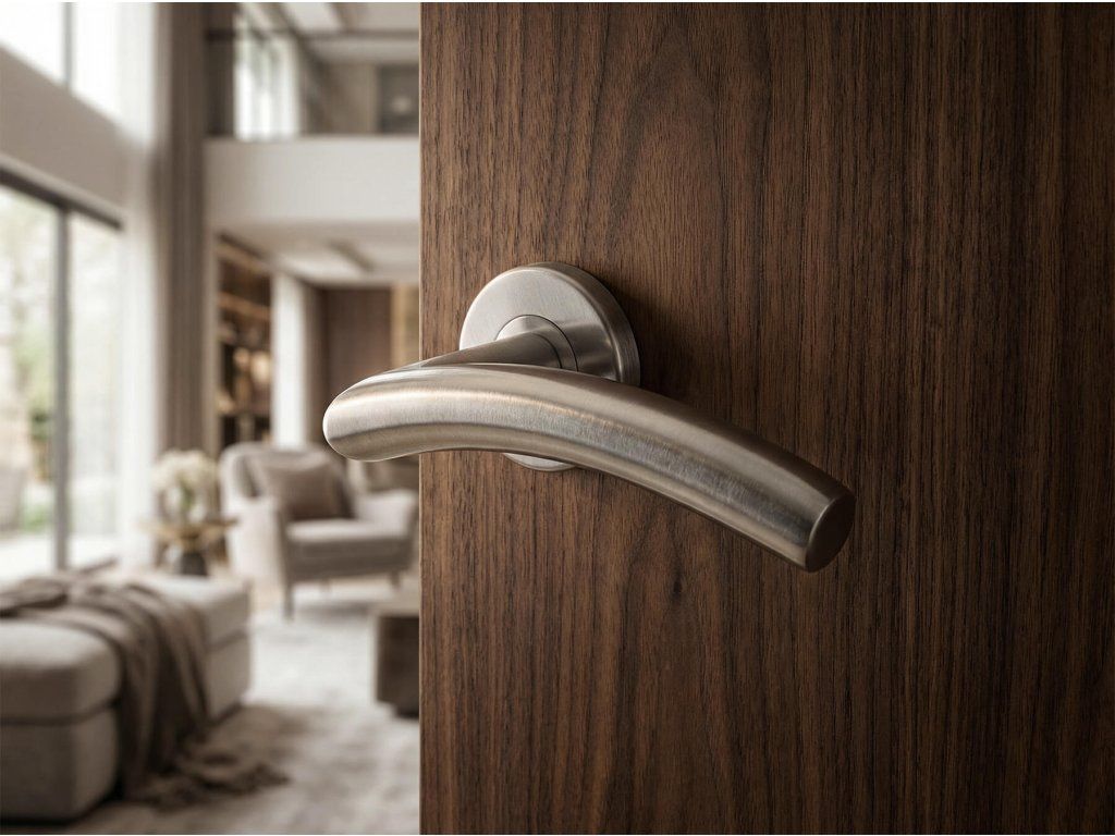 Rozetová kľučka na interiérové dvere s okrúhlou rozetou z vysokokvalitnej nehrdzavejúcej ocele, známej ako nerez a je povrchovo upravená.Rozeta má priemer 54 mm a hrúbku 9 mm.