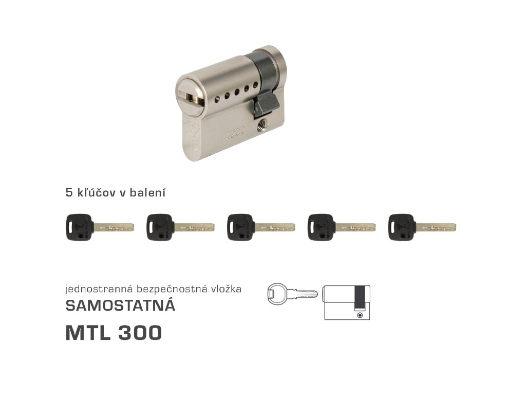 Bezpečnostná cylindrická polvložka MTL300 od Mul-T-Locku je základná bezpečnostná vložka s vysokou ochranou proti vlámaniu. Vložka obsahuje 7 stavítok v rade a jedno špeciálne patentované teleskopické stavítko, čo výrazne zvyšuje jej bezpečnostnú úroveň. Vložka MTL300 je vyrobená z kvalitných materiálov, ktoré zaručujú maximálnu bezpečnosť a ochranu. Je navrhnutá tak, aby odolala najnovším metódam útokov, vrátane planžetovania, odvŕtania, vytrhnutia, bumping metóde „SG“ a kopírovania kľúča. Táto odolnosť bola overená autorizovanými skúšobňami. Cylindrická vložka je použiteľná pre bezpečnostné otvorové výplne maximálne triedy RC3 len v kombinácii s bezpečnostným kovaním príslušnej triedy odolnosti proti vlámaniu podľa STN EN 1906:2012. Vložka nesmie presahovať kovanie o viac než 3 mm. Táto bezpečnostná cylindrická vložka je ideálna pre použitie vo vchodových dverách, interiérových dverách, bezpečnostných dverách, ktoré sú osadené štandardným dverným kovaním. Celkovo ide o vynikajúci produkt značky Mul-T-Lock, ktorý poskytuje vysoký stupeň bezpečnosti a ochrany. Vložky Mul-T-Lock MTL300 sú dodávané s 5 kľúčmi s plastovou hlavou a bezpečnostnou kartou, ktorá slúži ako podklad pre výrobu ďalších kľúčov v partnerskej kľúčovej službe. Bez bezpečnostnej karty nie je možné vyrobiť kópiu kľúča, preto odporúčame kartu starostlivo uschovať. 7 stavítok v jednoradovom usporiadaní teleskopická technológia (stavítko v stavítku) chránené patentom na jednom zo stavítok patentová ochrana kľúča do r. 2033 3. bezpečnostná trieda podľa STN EN 1627 NBÚ certifikácia na úrovni tajné, SS4=2 Upozornenie: Tieto vložky sú chránené bezpečnostnou kartou, ktorá má unikátny kód. Tento kód karty je neprenosný, a preto z uvedeného dôvodu nie je možné tento produkt vrátiť. V prípade, že potrebujete poradiť s výberom vložky alebo jednotlivými funkciami, kontaktujte naše zákaznícke oddelenie na e-mail: mp@mp-kovania.sk.Dodatočné parametre