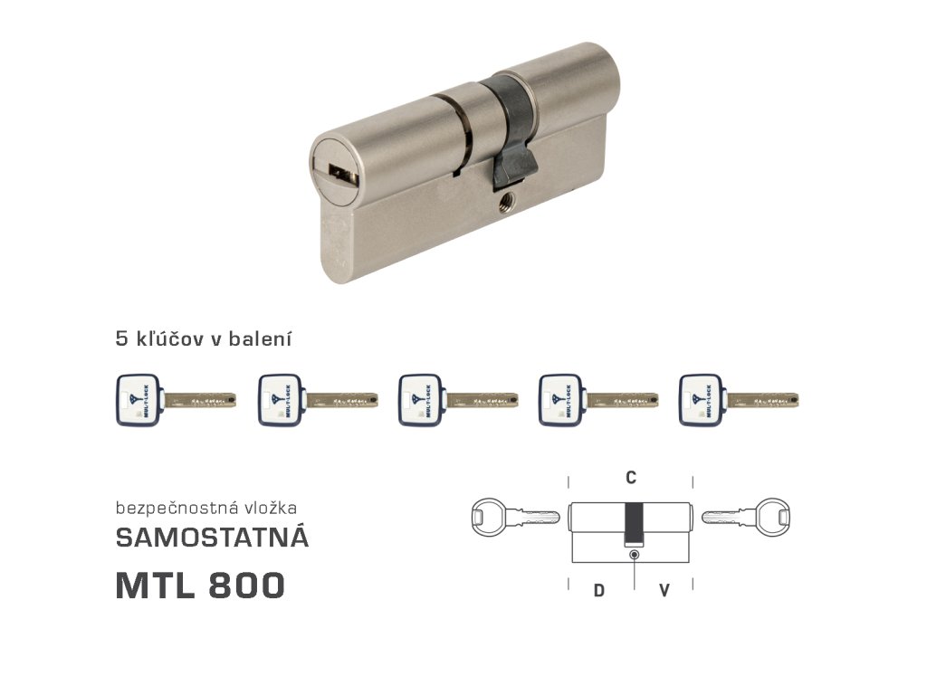 Bezpečnostná cylindrická vložka MTL800 od Mul-T-Locku, tiež známa ako MT5+ sa vyznačuje najvyššou úrovňou bezpečnosti. Vložka obsahuje unikátny systém 10tich teleskopických stavítok v rade a 5 neodpružených stavítok, ktoré ovládajú blokovaciu lištu pomocou hadovitého zárezu v kľúči. Vložka obsahuje aj excentrické interaktívne stavítko ovládané tzv. „dvojitou alfou“ pružinou. Tento systém zvyšuje bezpečnostnú úroveň vložky.Vložka MTL800 je vyrobená z kvalitných materiálov, ktoré zaručujú maximálnu bezpečnosť a ochranu. Je navrhnutá tak, aby odolala najnovším metódam útokov, vrátane planžetovania, odvŕtania, vytrhnutia, bumping metóde „SG“ a kopírovania kľúča. Táto odolnosť bola overená autorizovanými skúšobňami.Cylindrická vložka je použiteľná pre bezpečnostné otvorové výplne maximálne triedy RC4 podľa STN EN 1624:2021. Vyhovuje len v kombinácii s bezpečnostným kovaním príslušnej triedy odolnosti proti vlámaniu podľa STN EN 1906:2012. Vložka nesmie presahovať kovanie o viac než 3mm.Vložka MTL800 je vhodná pre extrémne náročné prostredie, kde sú potrebné vysoké bezpečnostné opatrenia a kde je potrebné chrániť cenné veci alebo informácie pred neoprávneným prístupom. MTL800 je často používaná v komerčných a priemyselných budovách, ako aj v rezidenčných domoch a bytoch.Vložky Mul-T-Lock MTL800 sú dodávané s 5 kľúčmi s plastovou hlavou a bezpečnostnou kartou, ktorá slúži ako podklad pre výrobu ďalších kľúčov v partnerskej kľúčovej službe. Bez bezpečnostnej karty nie je možné vyrobiť kópiu kľúča, preto odporúčame kartu starostlivo uschovať. Každá vložka MTL800 má v cene EMERGENCY (BSZ) funkciu (odomknutie dverí pri zasunutom kľúči na opačnej strane). Ku každej vložke MTL800 dostanete mazací a čistiaci sprej za 0,01€.K vložke MTL800 dostanete tiež doživotnú garanciu výmeny vložky za novú v prípade vykradnutia domácnosti po prekonaní vložky. Je nutné predložiť policajnú správu! 10 stavítok v teleskopickom usporiadaní BSZ - odomykanie pri zasunutom a pootočenom kľúči na opačnej strane 5 neodpružených prstových stavítok ovládaných hadovitým zárezom na kľúči excentrické interaktívne stavítko tzv. „dvojitá alfa“ ovládané pružinou v kľúči výroba výhradne na rezacom centre KC5, najvyššia ochrana distribúcii kľúčov ochrana proti 3D kopírovaniu patentová ochrana do roku 2039 4. bezpečnostná trieda podľa STN EN 1627 NBÚ certifikát typ 4, trieda odolnosti RC 4, prísne tajné EMERGENCY - ochrana proti vymknutiu v cene vložky čistiaci a mazací sprej za 0,01€ Upozornenie: Tieto vložky sú chránené bezpečnostnou kartou, ktorá má unikátny kód. Tento kód karty je neprenosný, a preto z uvedeného dôvodu nie je možné tento produkt vrátiť. V prípade, že potrebujete poradiť s výberom vložky alebo jednotlivými funkciami, kontaktujte naše zákaznícke oddelenie na e-mail: mp@mp-kovania.sk.Dodatočné parametre