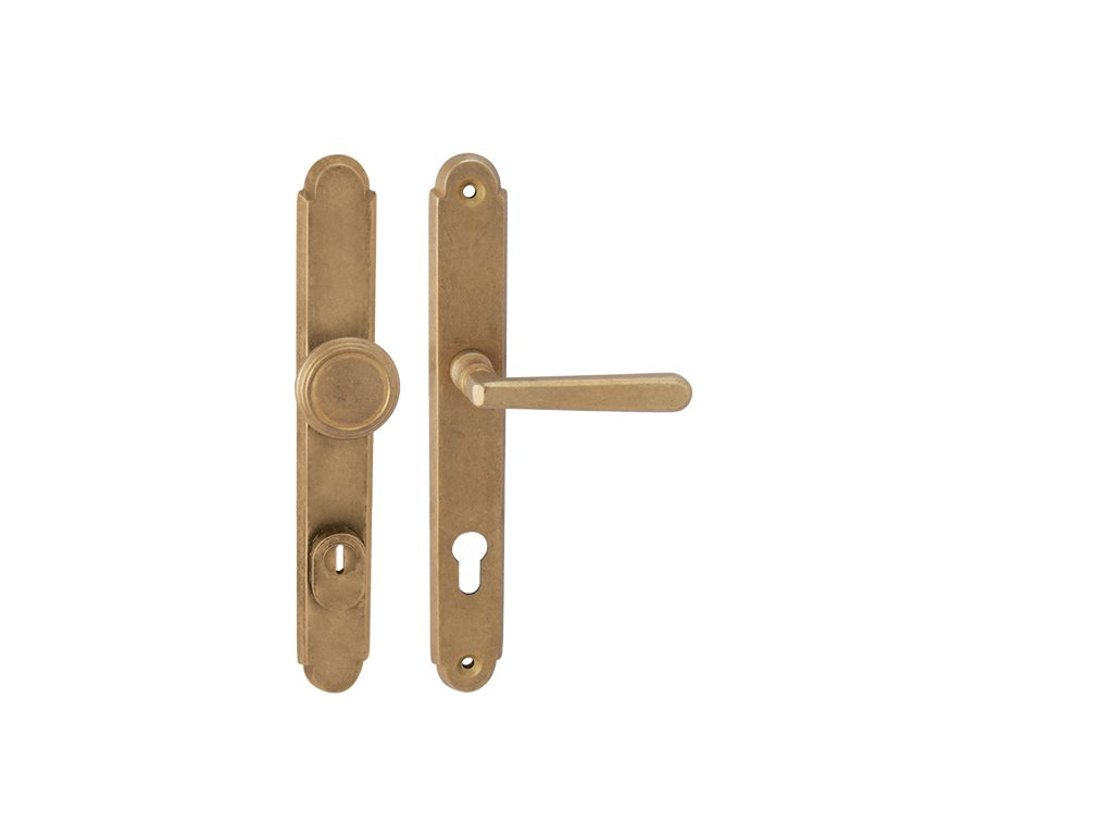 Štítová kľučka na vchodové a bezpečnostné dvere so spevneným rustikálnym štítom s prekrytím cylindrickej vložky je vyrobená z materiálov vysokej kvality – mosadz a je povrchovo upravená.