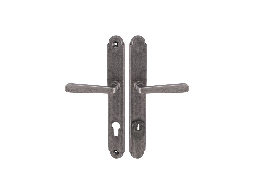 Štítová kľučka na vchodové a bezpečnostné dvere so spevneným rustikálnym štítom s prekrytím cylindrickej vložky je vyrobená z materiálov vysokej kvality – mosadz a je povrchovo upravená.