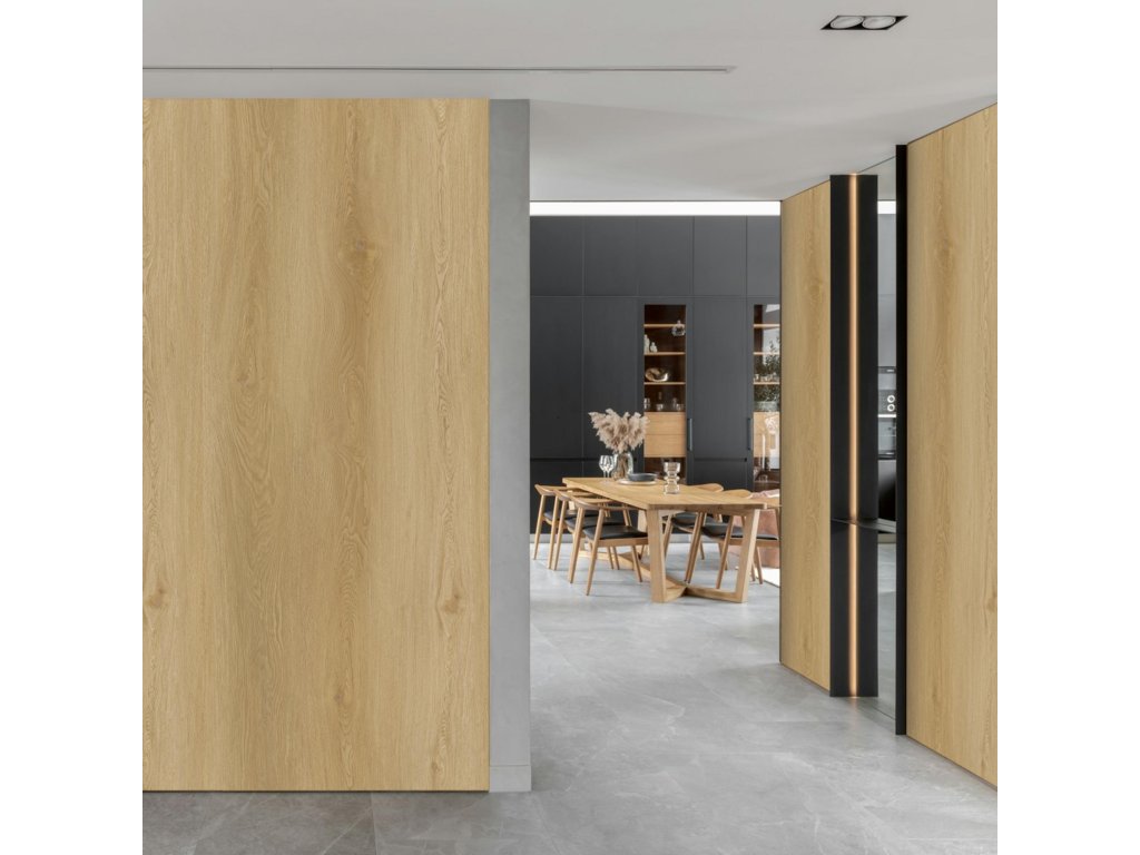 Kolekcia True Wood – Slabs interpretuje prirodzenú kresbu dreva vo veľkoformátovom elegantnom riešení. Panely s rozmermi 1175 × 2800 mm a hrúbkou 4 mm pôsobia ako masívne drevené tabule, no v ľahkom a vodoodolnom minerálnom vyhotovení.