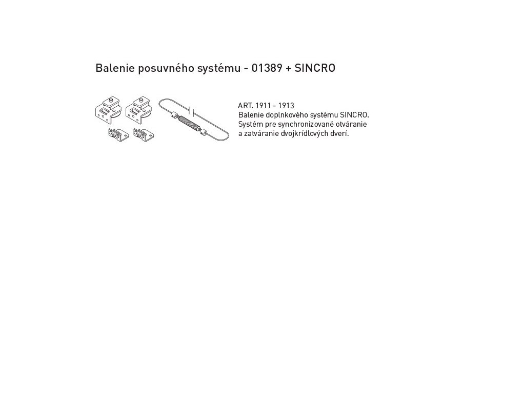 Náhradné diely k posuvným systémom SILENT. Posuvné systémy SILENT sú inovatívne riešenia s perfektnou funkčnosťou, bezproblémovým a tichým chodom a sú moderným riešením interiérov. Okrem kvality a spoľahlivosti posuvné systémy SILENT umožňujú spomalenie a tlmenie v oboch smeroch, rovnako ako synchrónne otváranie a zatváranie dvojkrídlových dverí vďaka doplnkovému systému SINCRO. Týmto systémom dosiahnete pohodlné súčasné ovládanie oboch dverí jedným pohybompre ešte vyšší komfort. Systém SINCRO je možné použiť pre všetky typy horných vodiacich profilov a systémov SILENT 100 bez alebo so spomaľovačmi a s rôznouváhou krídiel dverí do 40 - 80 - 100 - 120 kg.Dodatočné parametre