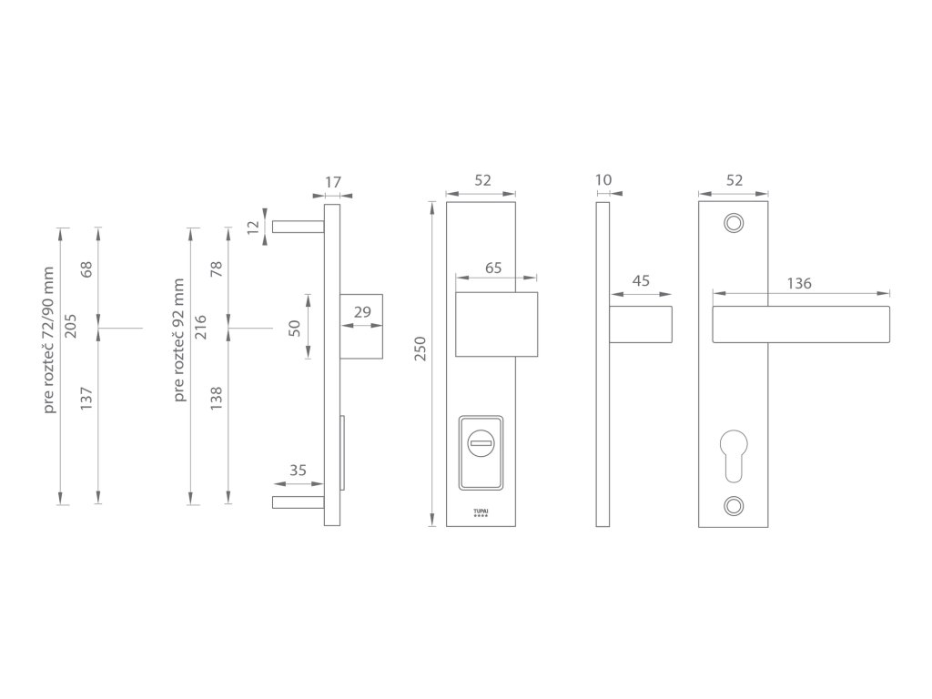 Upozornenie: PLUS označuje prekrytie cylindrickej vložky. Pri bezpečnostnom kovaní je potrebné poznať vzdialenosť medzi osou kľučky a osou kľúča (rozteč). Štandardná vzdialenosť je 72, 90 alebo 92 mm. Kovanie s roztečou 72 a 90 mm je štandardom pre hrúbku dverí od 38 mm do 50 mm. Kovanie s roztečou 92 mm je štandardom pre hrúbku dverí od 68 mm do 78 mm.