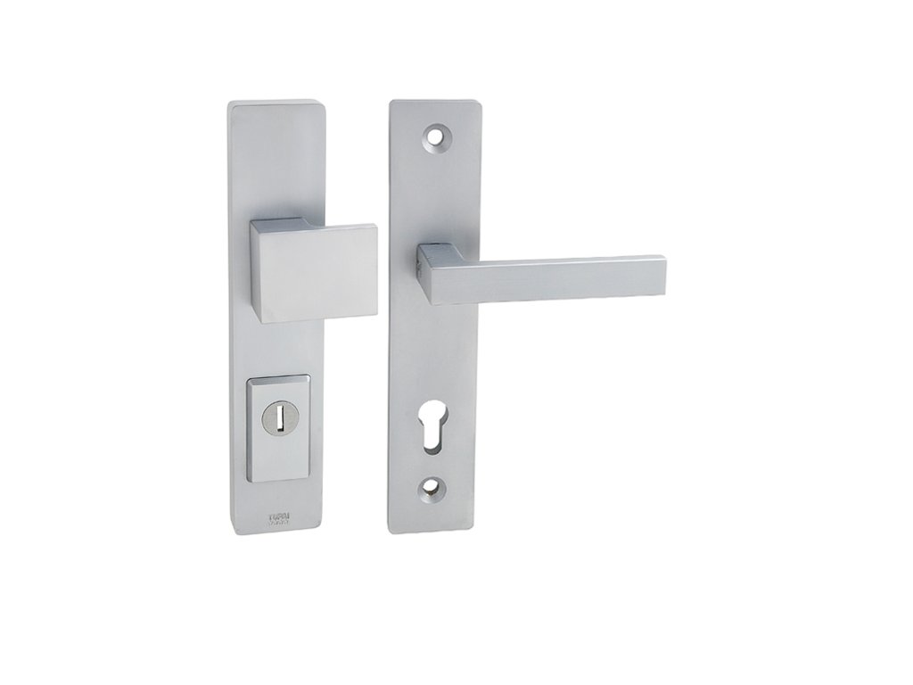 Štítová kľučka na vchodové a bezpečnostné dvere s bezpečnostným hranatým štítom s prekrytím cylindrickej vložky je vyrobená z hliníka a je povrchovo upravená.Hranatý štít má rozmery 52 mm x 242 mm a hrúbku 15 mm.