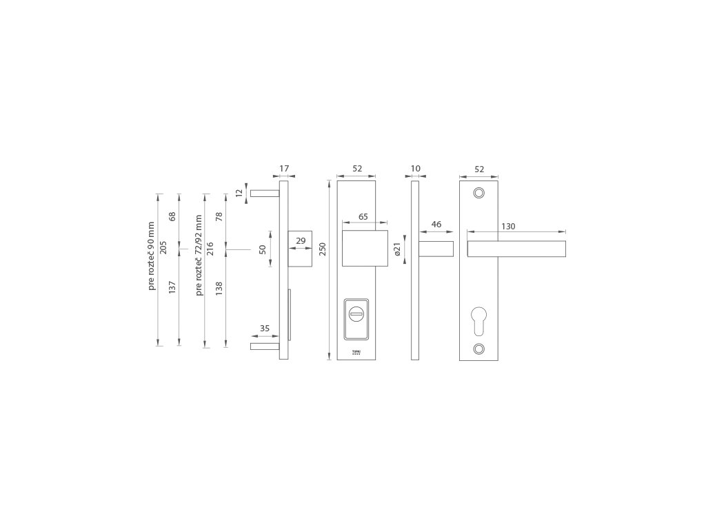 Upozornenie: PLUS označuje prekrytie cylindrickej vložky. Pri bezpečnostnom kovaní je potrebné poznať vzdialenosť medzi osou kľučky a osou kľúča (rozteč). Štandardná vzdialenosť je 72, 90 alebo 92 mm. Kovanie s roztečou 72 a 90 mm je štandardom pre hrúbku dverí od 38 mm do 50 mm. Kovanie s roztečou 92 mm je štandardom pre hrúbku dverí od 68 mm do 78 mm.